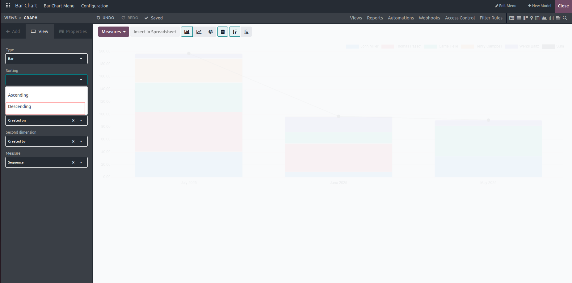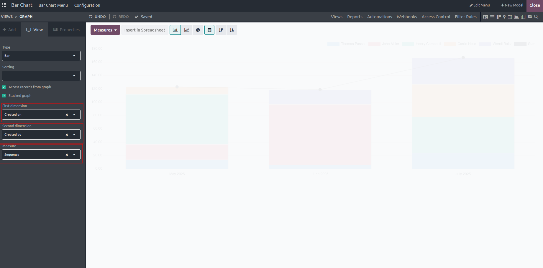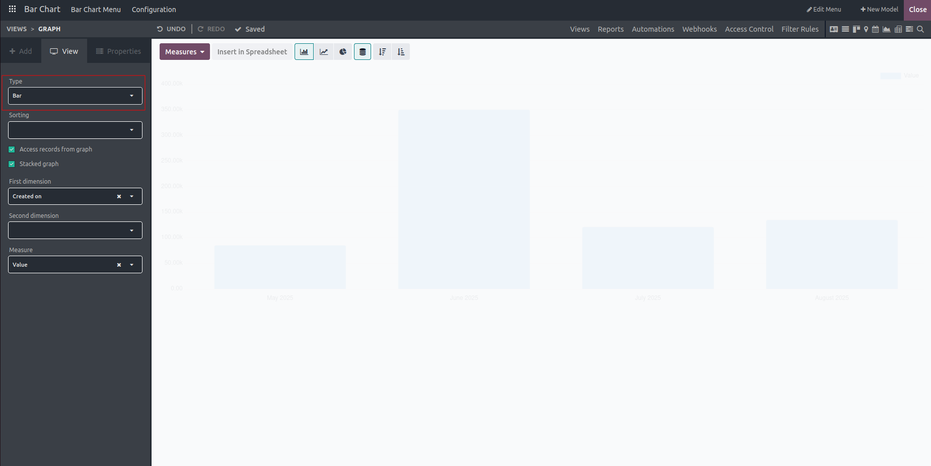 In conclusion, the bar chart feature in Odoo's Studio module enables users to present categorical or discrete data in a clear and accessible way, making it easier to identify patterns, trends, and comparisons. Whether analyzing sales performance, monitoring inventory levels, or tracking project progress, the bar chart offers a flexible and powerful tool for visualizing data and generating valuable insights.