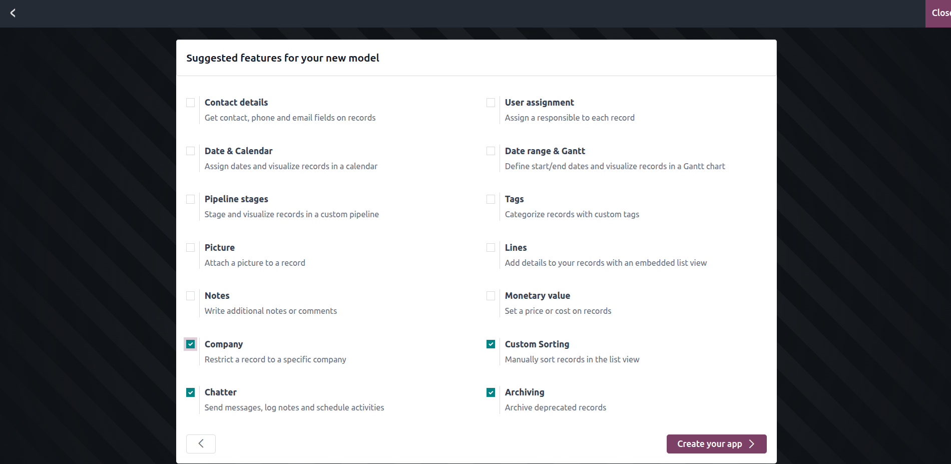 In the next step, you’ll be presented with a list of optional features to include in your app. These can add powerful capabilities like: