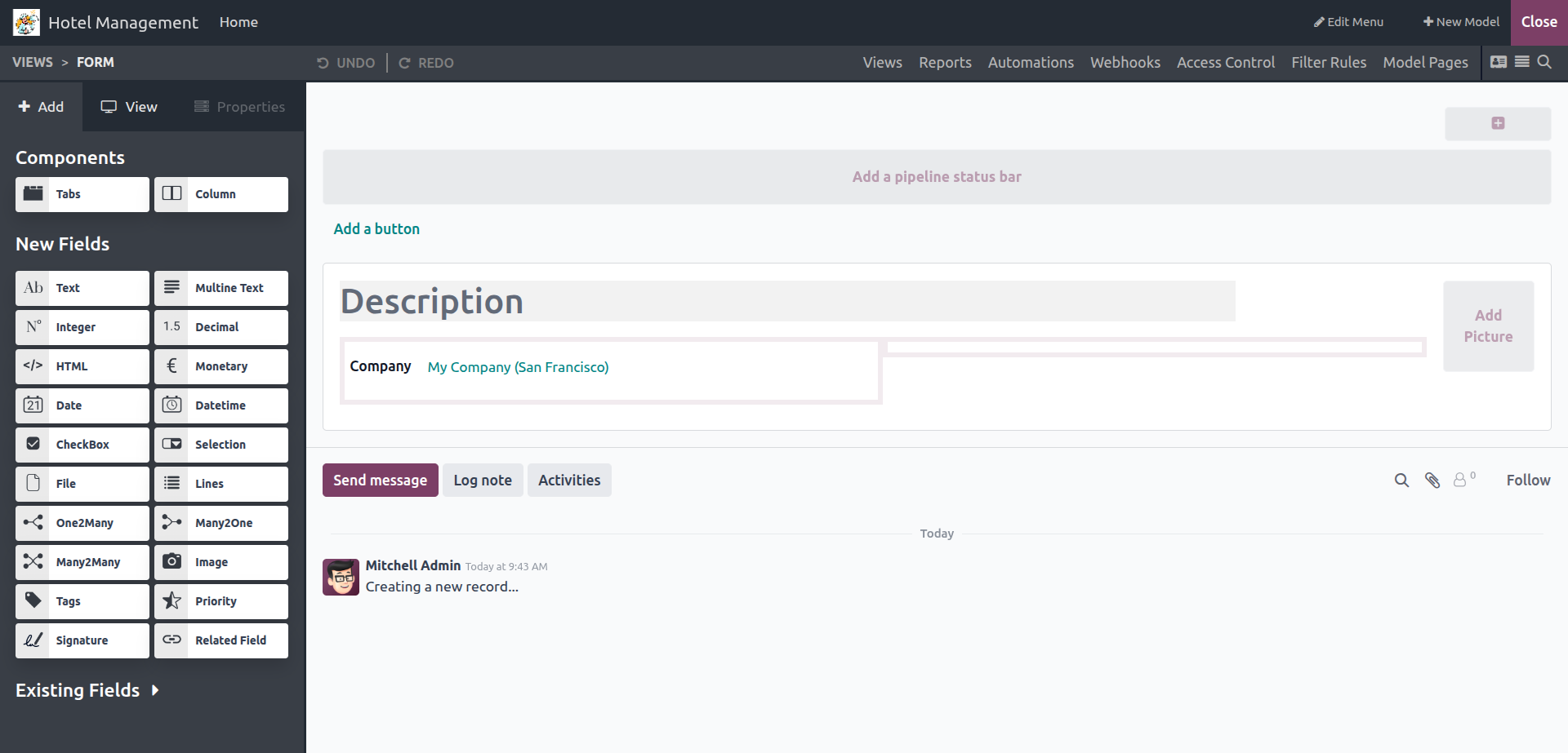 Once you click the “Create your app” button, Odoo will generate the application using your inputs, name, menus, and selected features. You’ll then be taken to a screen where you can start adding fields, forms, views, and other components to make the app functional.
