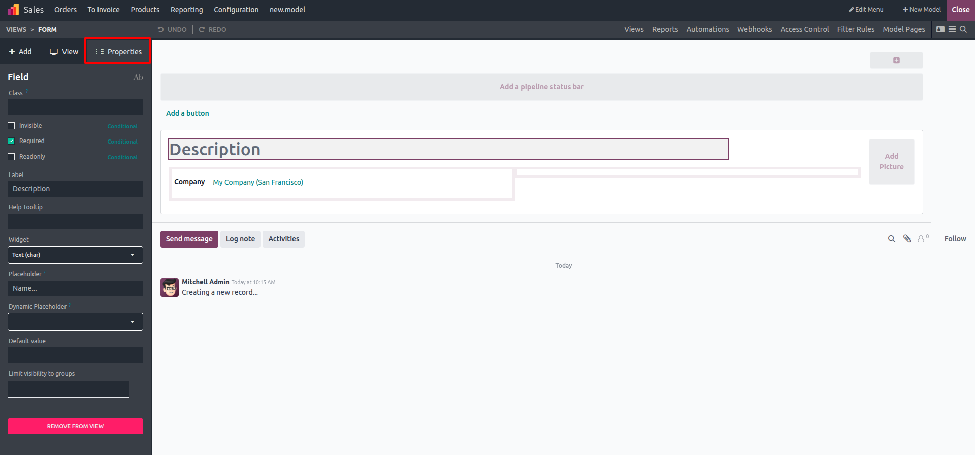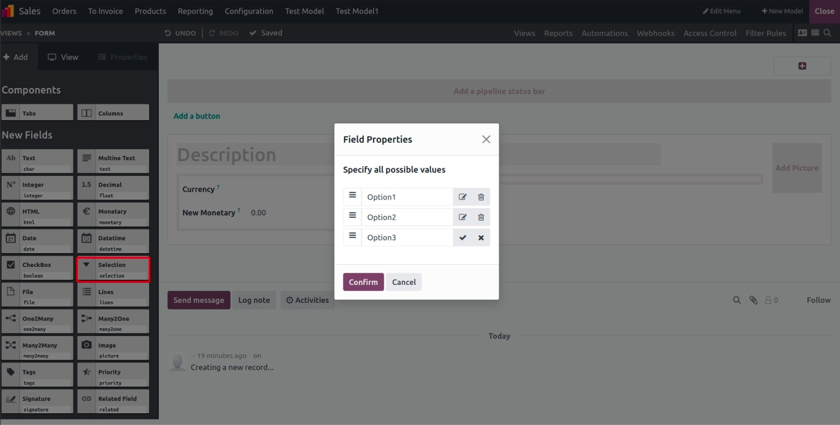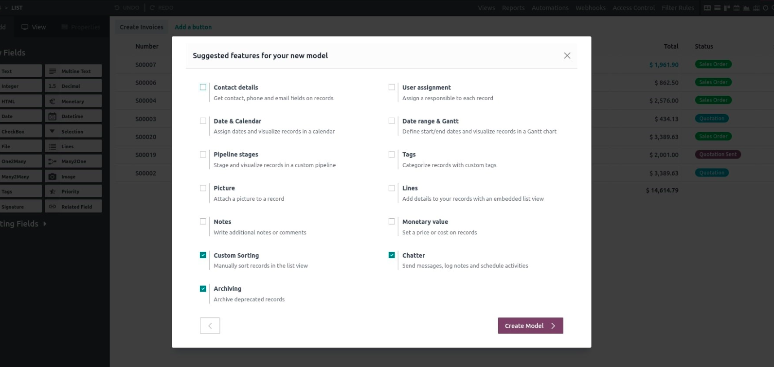 After naming your model, you can choose to enable features such as chatter, notes, or company-specific rules.