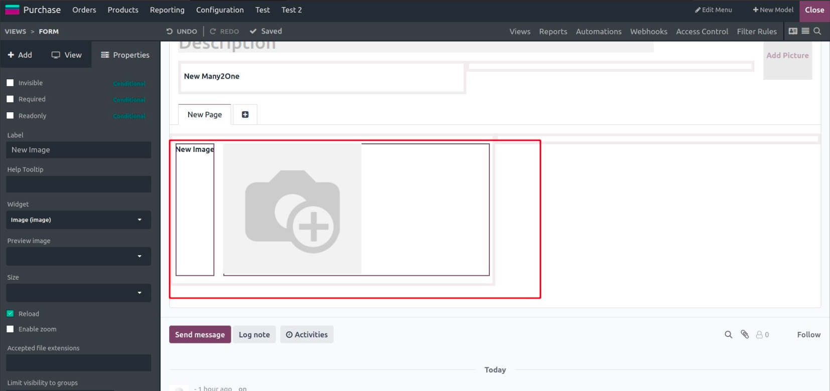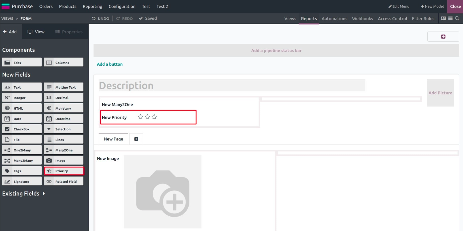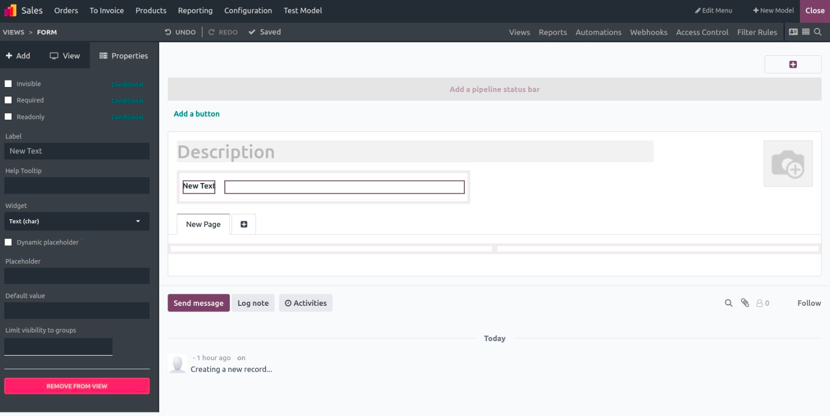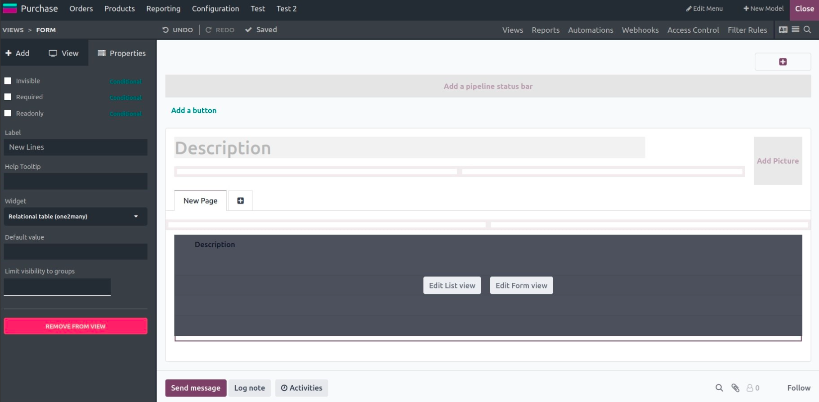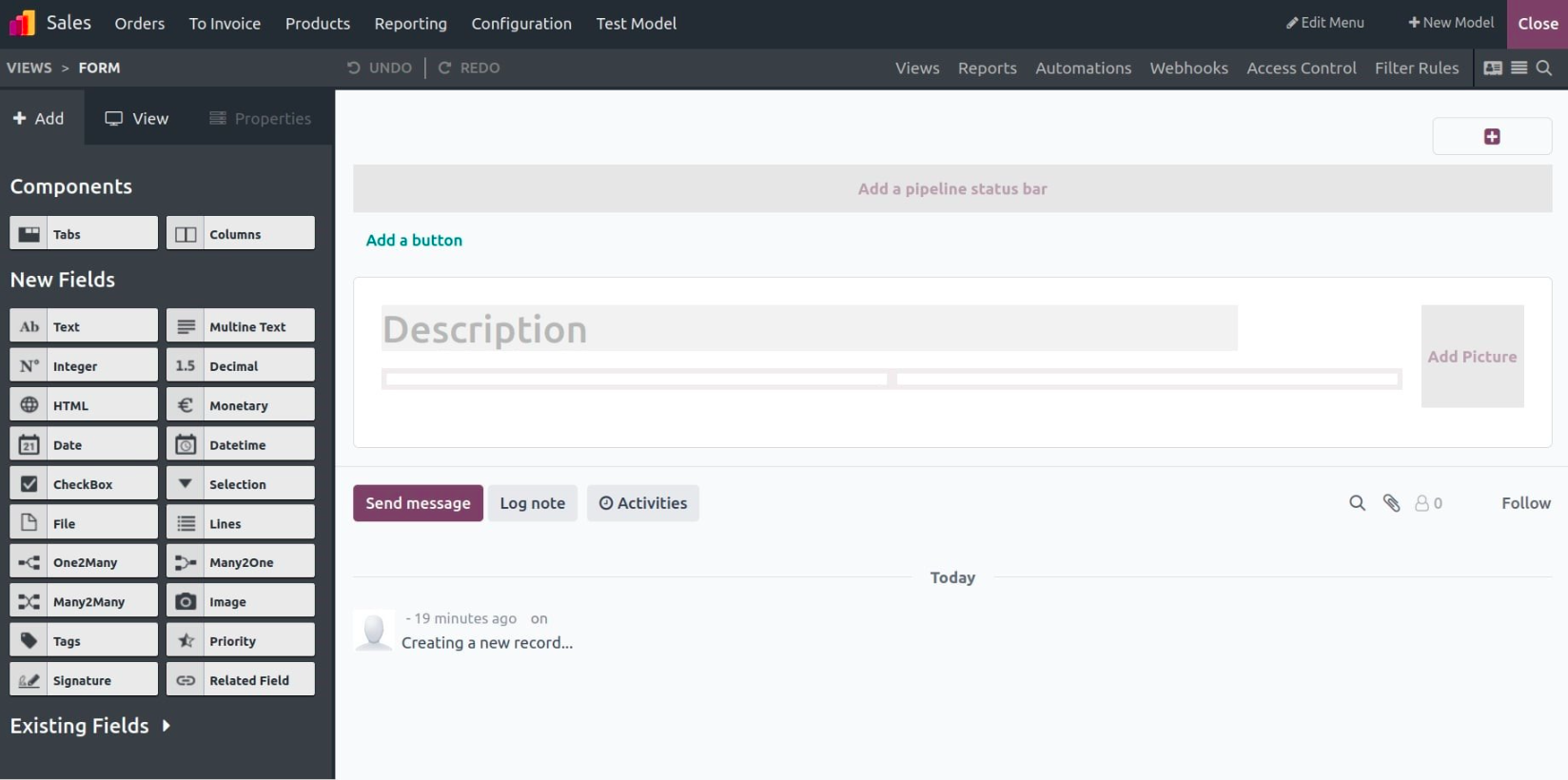 The form view displays one record at a time and is commonly used for data entry or editing. You can drag components and fields directly into the layout, rearrange them freely, and structure the form with tabs, pages, or groups.