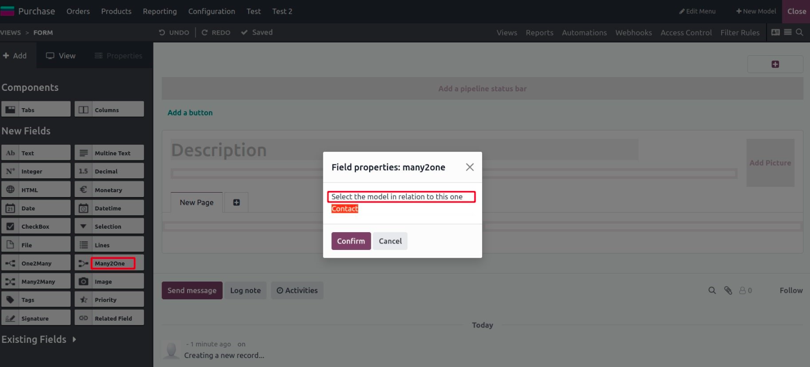 - Many2One:Links the record to another model. You must define the related model.