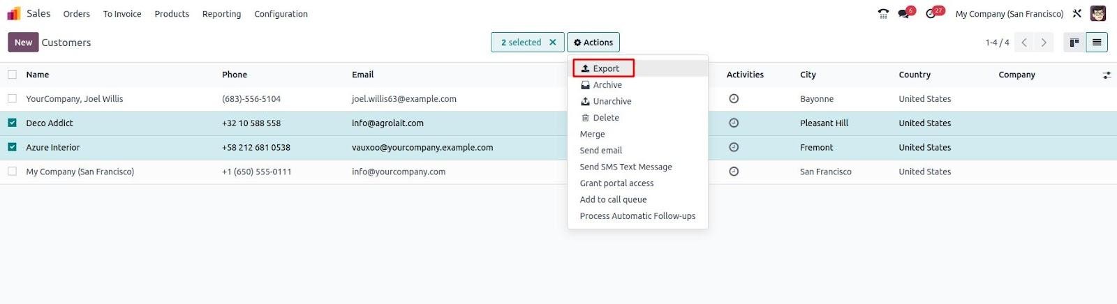Select the 'Export' option from the dropdown list under the Action button.
