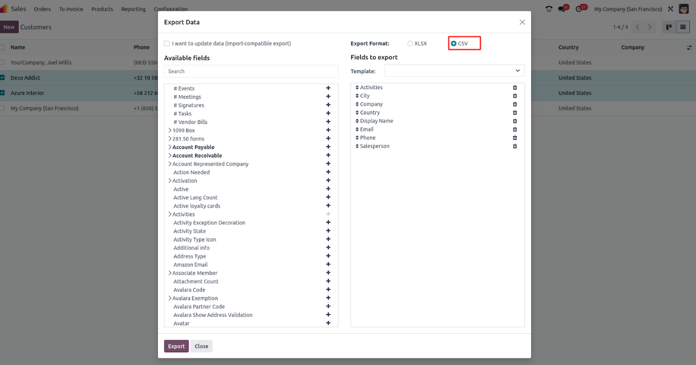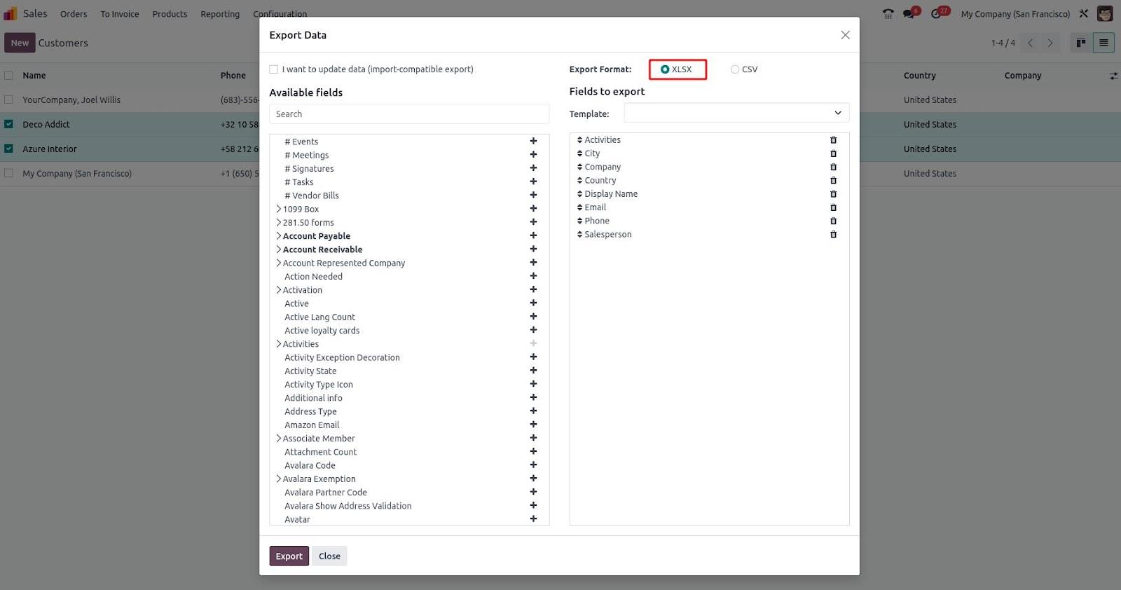 In the export window, you can choose the fields you wish to include. After selecting the required fields from the available list, pick your preferred export format, such as XLSX or CSV.