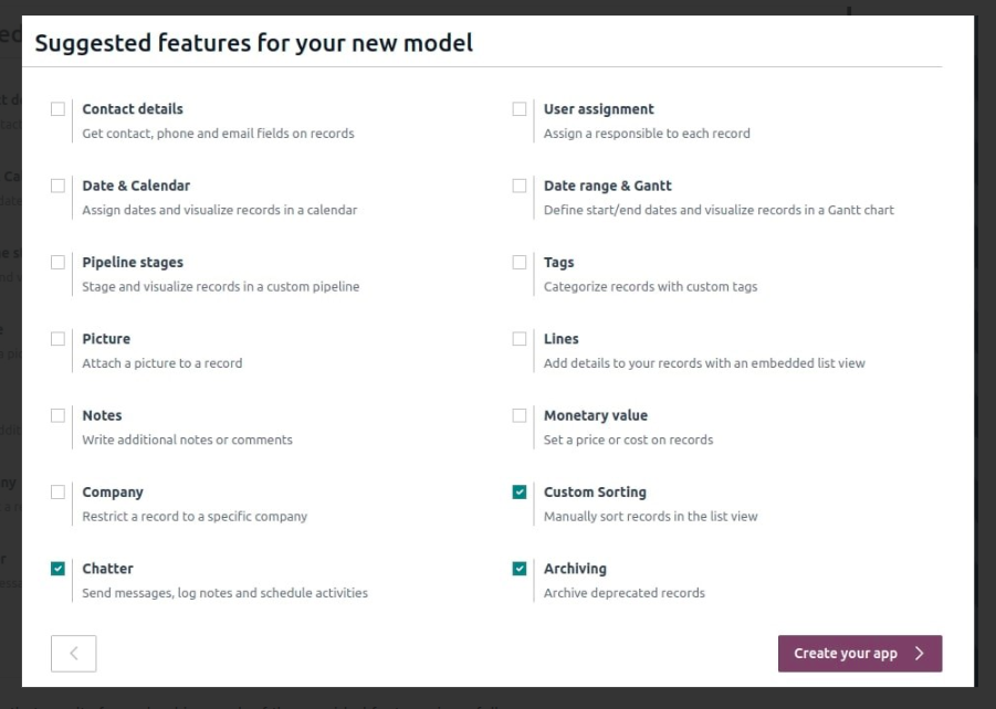 If you choose “New Model”, Studio will show a dialog with a list of optional standard features. Enabling these options automatically sets up related fields, views, or widgets for you.