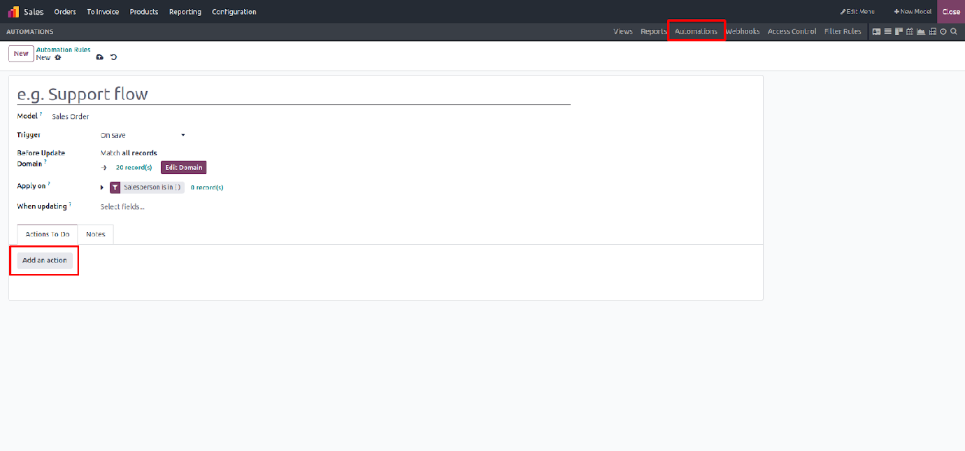 In this guide, we’ll demonstrate how to create an automation using Python to automatically confirm a sales order if its total amount is less than 500. To begin, open Studio, navigate to Automations, and click the Create button to set up a new automation rule.