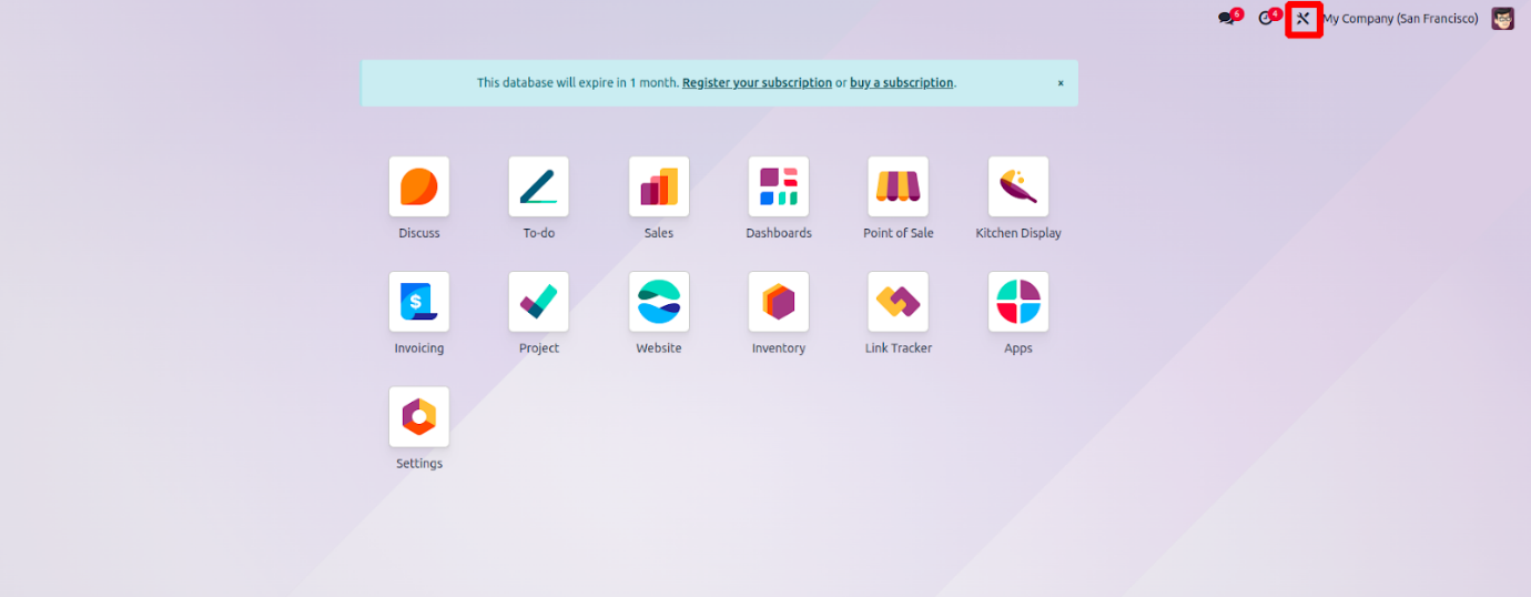 To begin using the features provided by the Studio module, start by installing it from the Odoo Apps section. After installation, a customization tool button will appear in the top navigation bar, allowing easy access to Studio’s functionalities, as shown in the illustration below.
