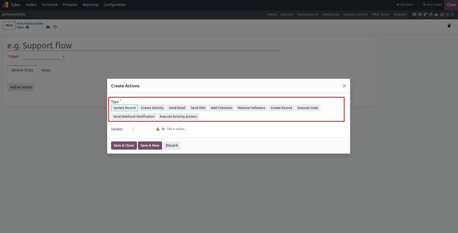 A single automated action can trigger multiple tasks. The types of actions available under the "Action To Do" section are listed below.