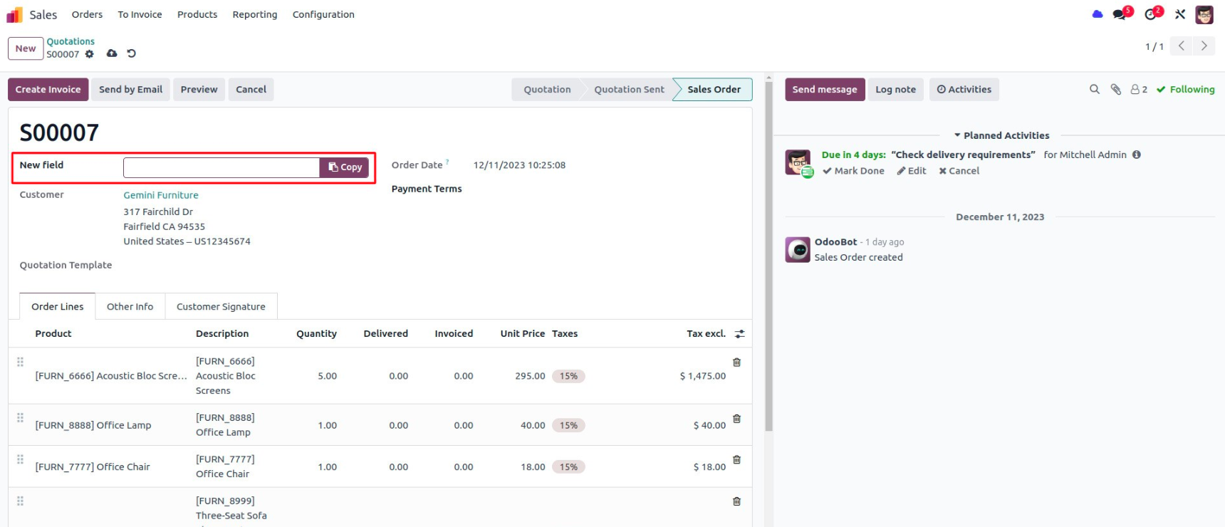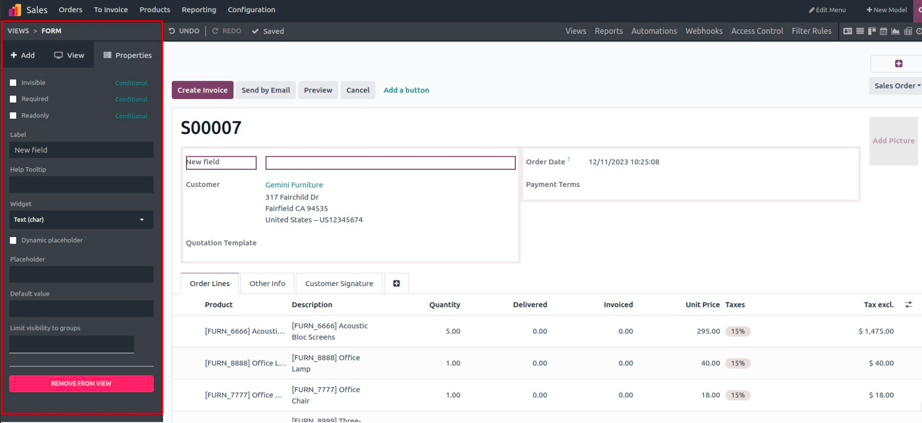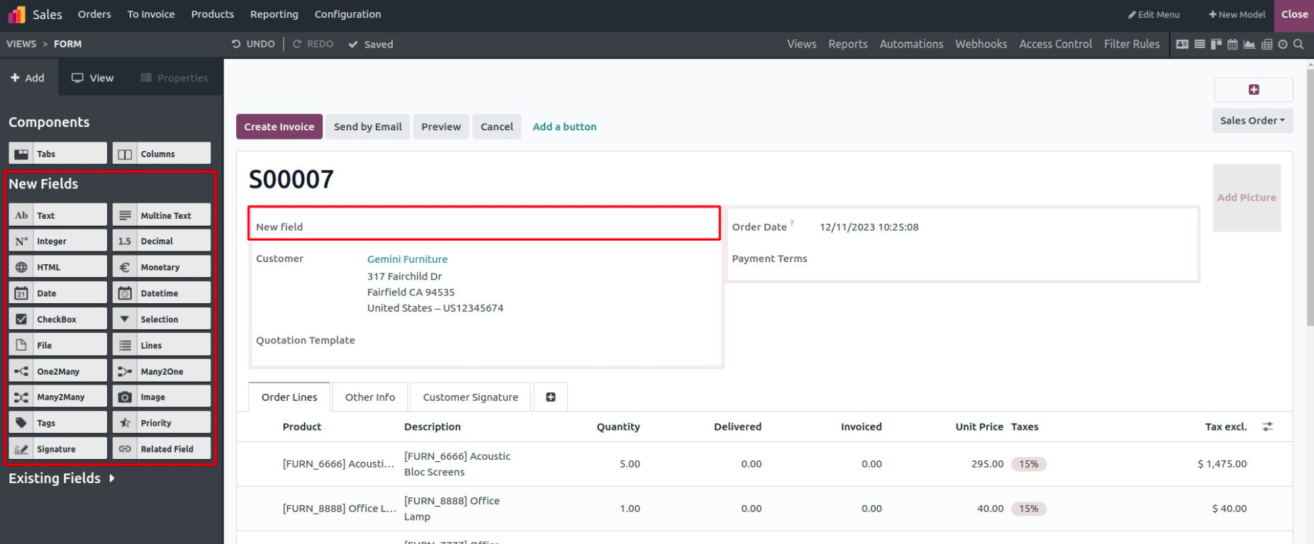 Navigate to the form view of the model you want to customize. Drag and drop a new custom field into the form layout from the side panel.