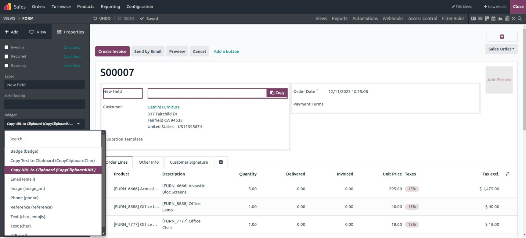 When creating or modifying fields in Odoo Studio, you can enhance how users interact with those fields using widgets. A widget defines how data is displayed and interacted with in the user interface. For example, a text field can become a clickable link, an email input, or a badge with just a few clicks.