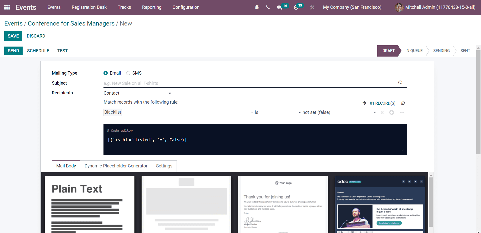 You can create invitation mail or SMS on this platform just like we discussed in the Email and SMS Marketing modules. You can check these modules in Odoo 15 Enterprise Book to get more details about the creation of marketing Emails or SMS.