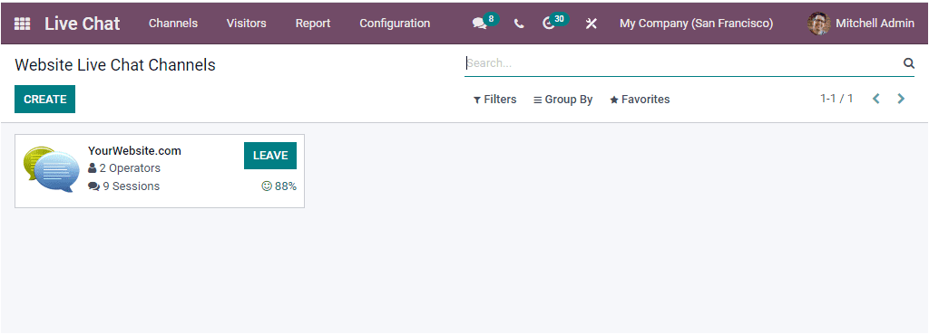 This window will display all the Live Chat channels that are already created on the platform. The window will display channels in the kanban format, and this window will give you a preview of every already described Live Chat channel. By viewing this window itself, you will get all the essential details of the live chat channel such as Name of the Website Channel, Number of Operators, Number of Sessions, Percentage of happy ratings, and the LEAVE or JOIN button. The window also allows you to apply various custom filters using the Filters and Group By tab. The Favourites tab includes the save current search, import records, Link menu in spreadsheet, Add to my dashboard, and Add to Google Spreadsheet options to perform the corresponding operations. The window also allows you to create new Website Live Chat Channels. To do this, you can click on the CREATE button, which can be accessed from the top left corner of the window. Now you will enter into a new window where you can view a creation form as shown in the image below.