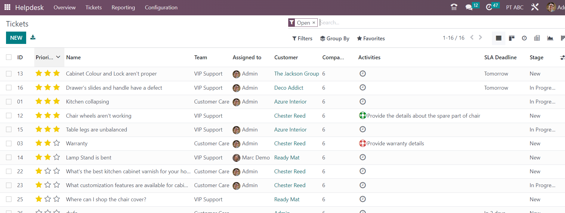 The list view of the Tickets is shown above. Apart from the list view, you can use Kanban, Activity, Pivot, Graph, and Cohort views as per your demands. The preview of the list includes ID, Priority, Name, Team, Assigned to, Customer, Company, Activities, SLA Deadline, and Stage. The view can be expanded using additional fields which can be activated from the list that appear after clicking on the menu available in the right corner of the list view.