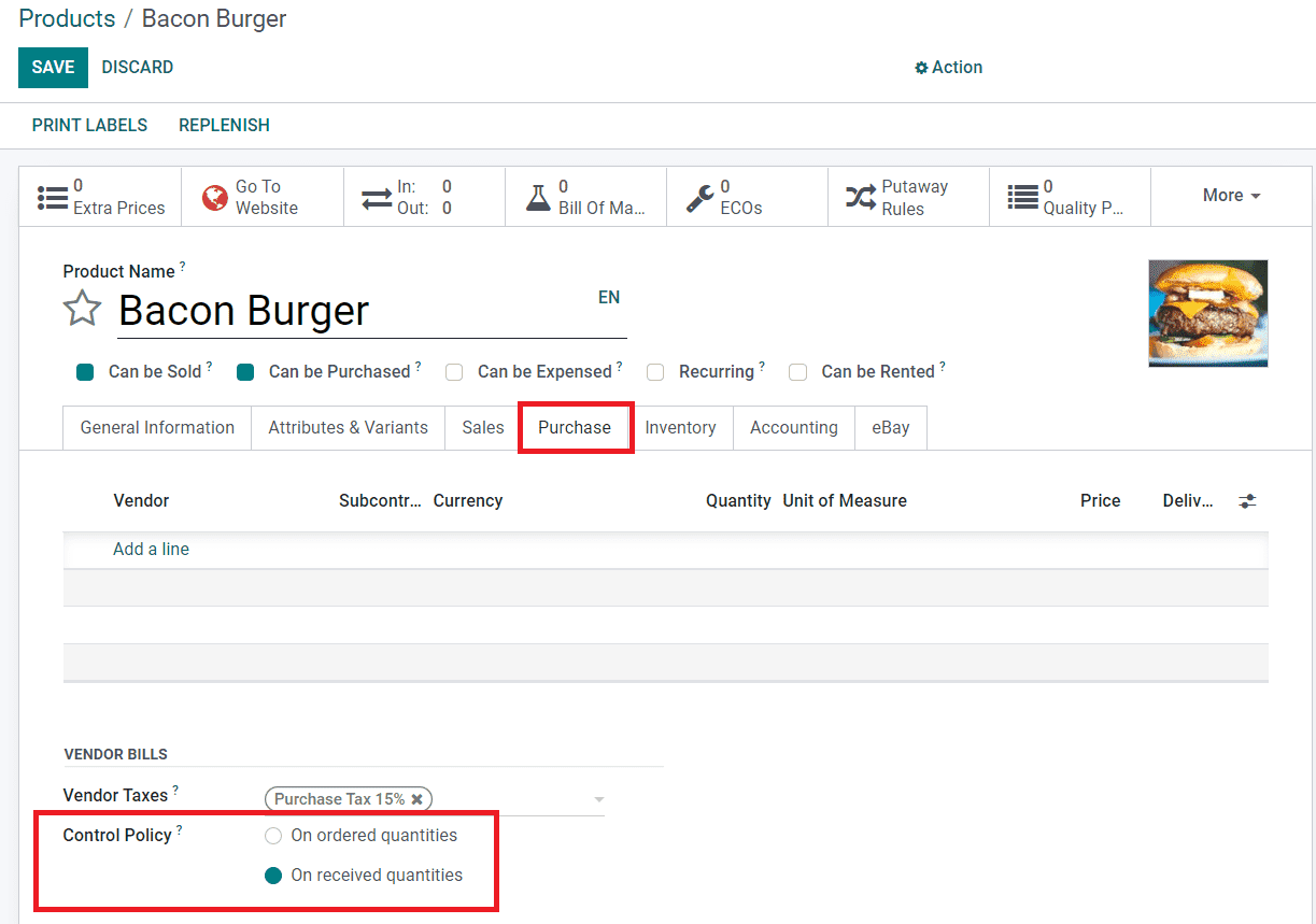 Here, you will be able to see the Bill Control option under the Invoicing tab which will help you to set the policy to create vendor bills. You can decide how the vendor bills should be controlled with the help of this option. The control policy you select here will decide when the vendor bill needs to be paid after confirming a purchase order. You can pay your vendor bills before receiving products or after receiving products. After confirming a purchase order, you can immediately pay your vendor bill for the products that you ordered using the Ordered Quantities bill control option. Here, the quantities mentioned in the respective purchase order will be considered to generate a draft vendor bill. The Received Quantities option can be used to generate vendor bills after receiving the ordered products. You can pay the vendor bill using this option based on the quantities you have received.