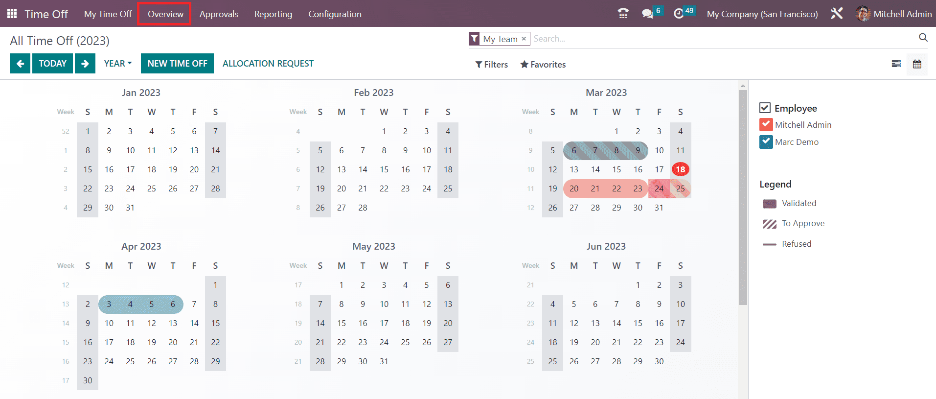 The Overview menu available in the Time Off module will show the time off calendar of all employees. The HR manager can use this window to monitor the time off calendar of all employees in a company. The time off taken by each employee will be shown in different colors. The colors assigned for each employee can be viewed on the right side of the dashboard.