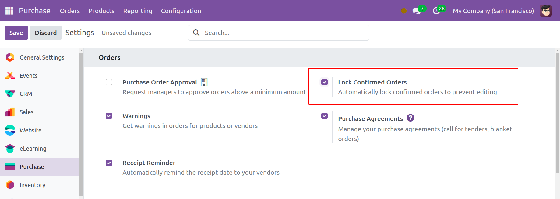 By selecting "Send by Email," just like we did when creating the RFQ, you may email this to the chosen vendor as a request for a quote. You can use the "Confirm Order" button to instantly confirm the transaction and carry out the purchase. You can see that the status is Purchase Order. You can automatically lock confirmed orders to prevent editing by activating the Lock Confirmed Orders feature from the Settings menu.
