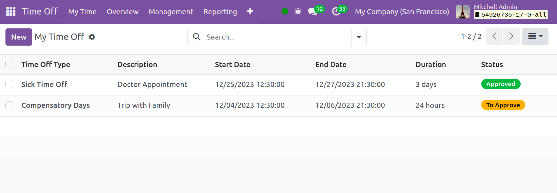 Off," "Compensatory Days," "Sick Time Off," "Extra Hours," and "Unpaid," among others.