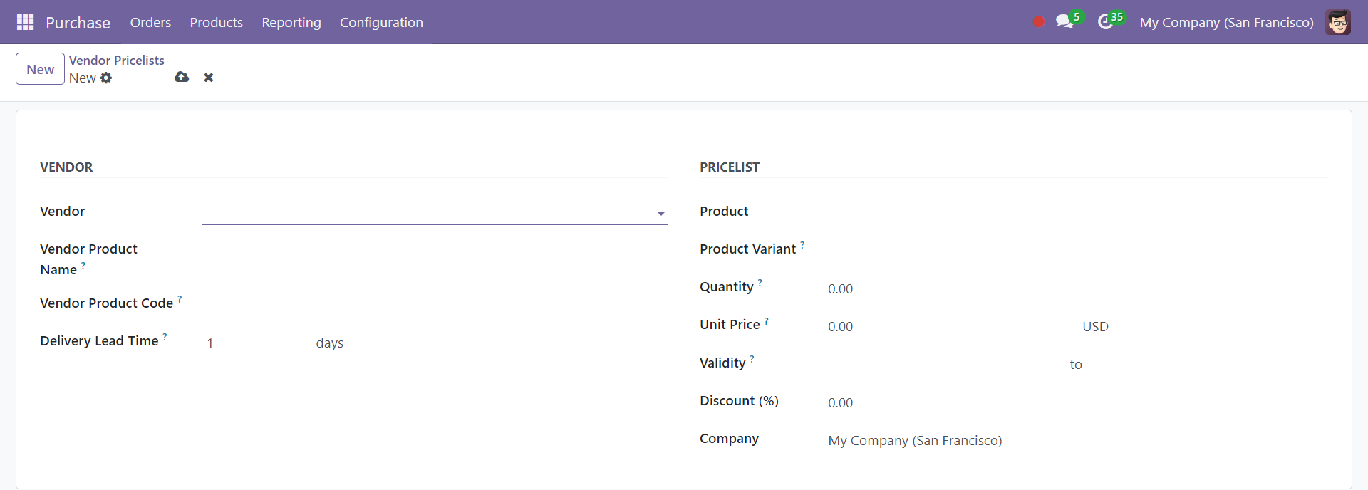 To create a new vendor price list, simply click on the New button. A form view will appear, allowing you to configure the new vendor price list by filling in the required details.