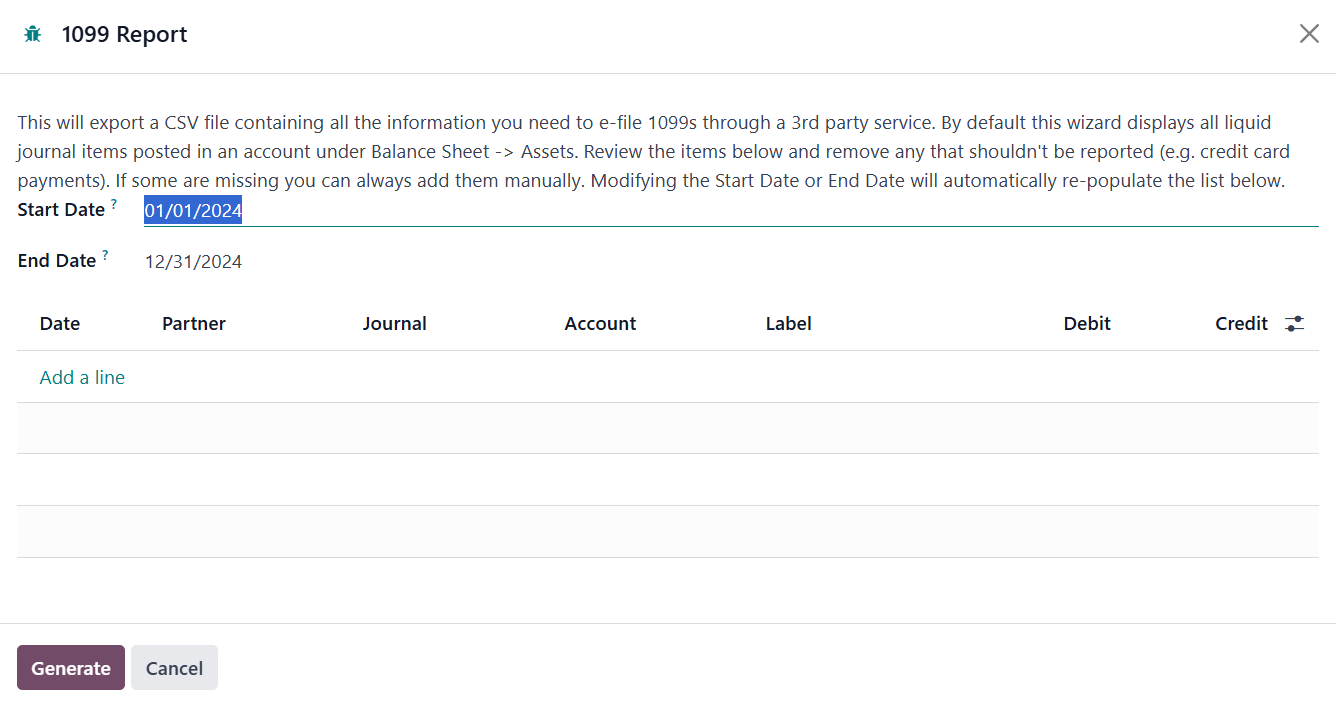 Accounting ▸ Reporting ▸ 1099 Reports. Select the start and end