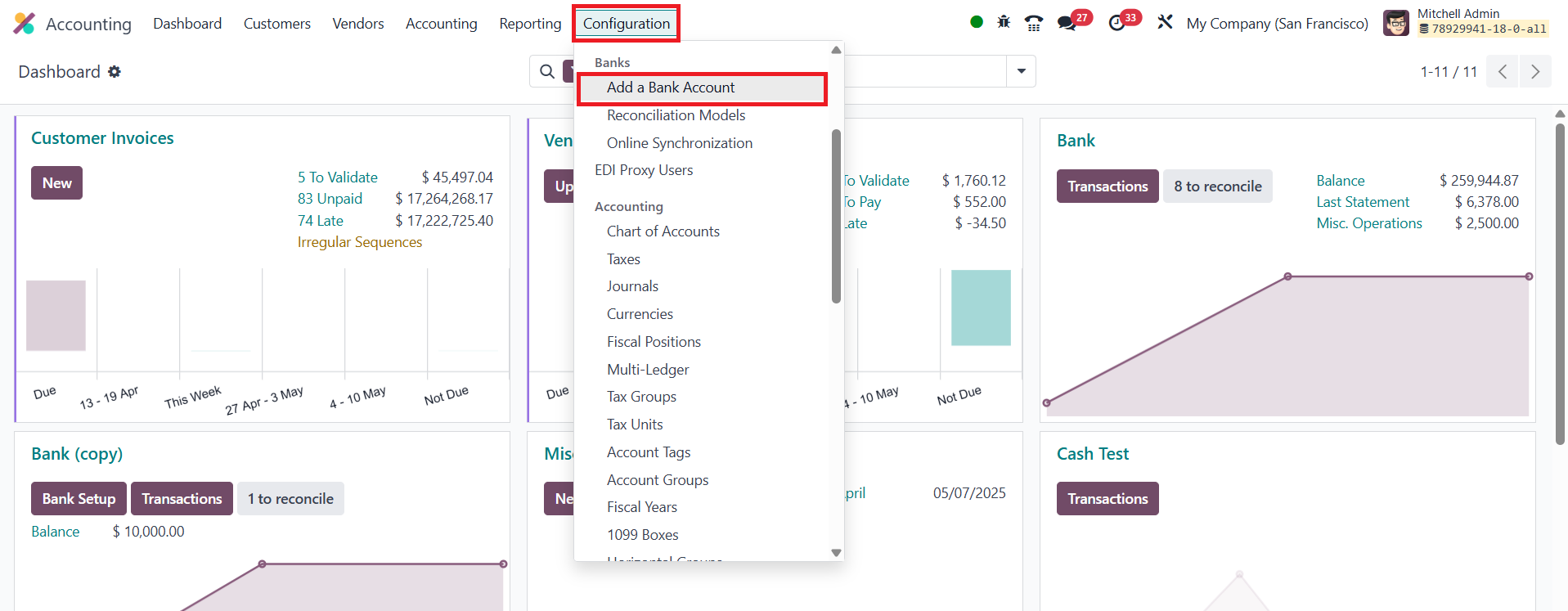 From the Accounting dashboard, open the Configuration menu and choose Add a Bank Account. This launches a wizard that first tries to match your institution against Odoo’s built‑in directory of global banks.