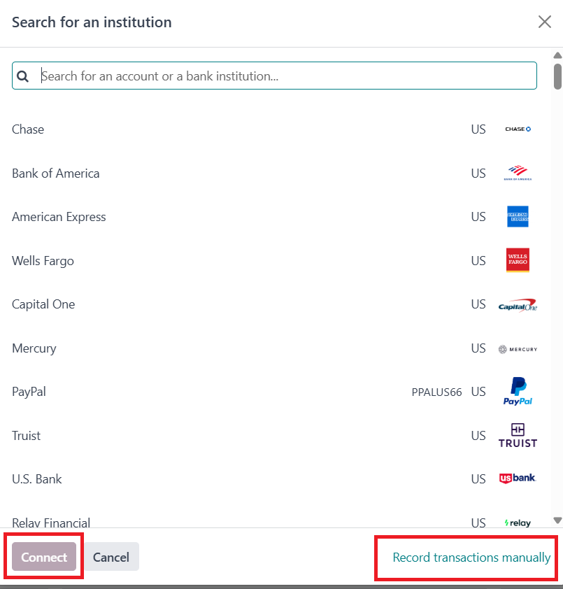 If you spot your bank in the list, simply select it and hit Connect; Odoo drops you into a guided form where you record the account number, currency, journal, and any online‑sync credentials your provider supports. If your institution isn’t listed, or you prefer not to use an online feed, choose Add a Bank Account but scroll to the bottom of the pop‑up and press Record Transactions Manually.