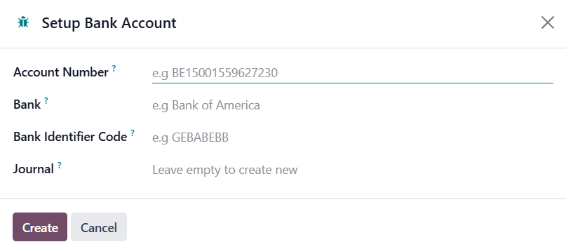 A blank form opens where you enter the Account Number, Bank, Bank Identifier Code, and Journal, then create. The account is now recorded in your database and ready for manual statement uploads, reconciliations, and payment processing.