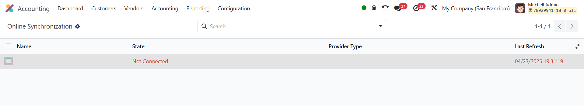 In Odoo 18 Accounting, the Online Synchronization feature gives you a hands‑free way to keep your on‑premise database and your Odoo Cloud account perfectly aligned; so every bank statement, payment, and reconciliation you record in one environment is automatically reflected in the other. Start by opening the Accounting module and select the Online Synchronization from the Configuration menu.