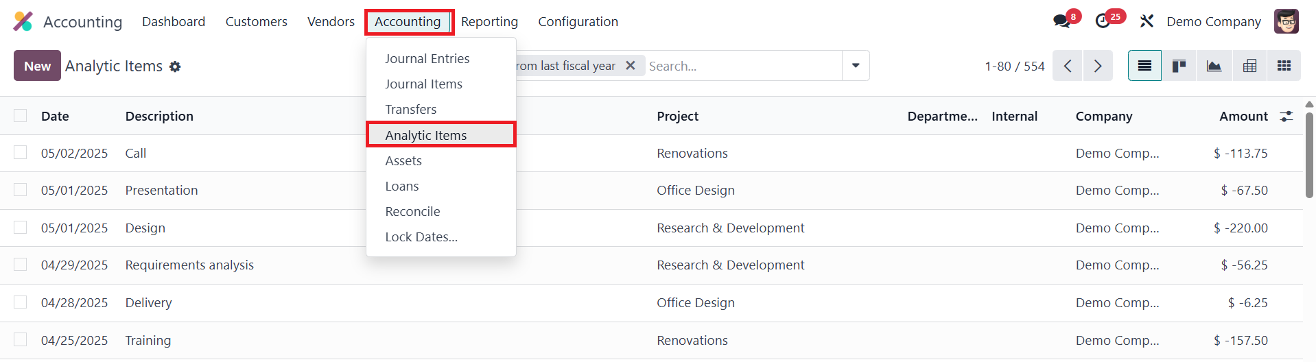 You can access and manage analytic items from the Accounting menu by selecting the Analytic Items option, which opens a list view showing key details such as the date, description, analytic account, project, company, and the amount involved in each entry. This view makes it easier to monitor how different transactions contribute to various cost centers or revenue streams.