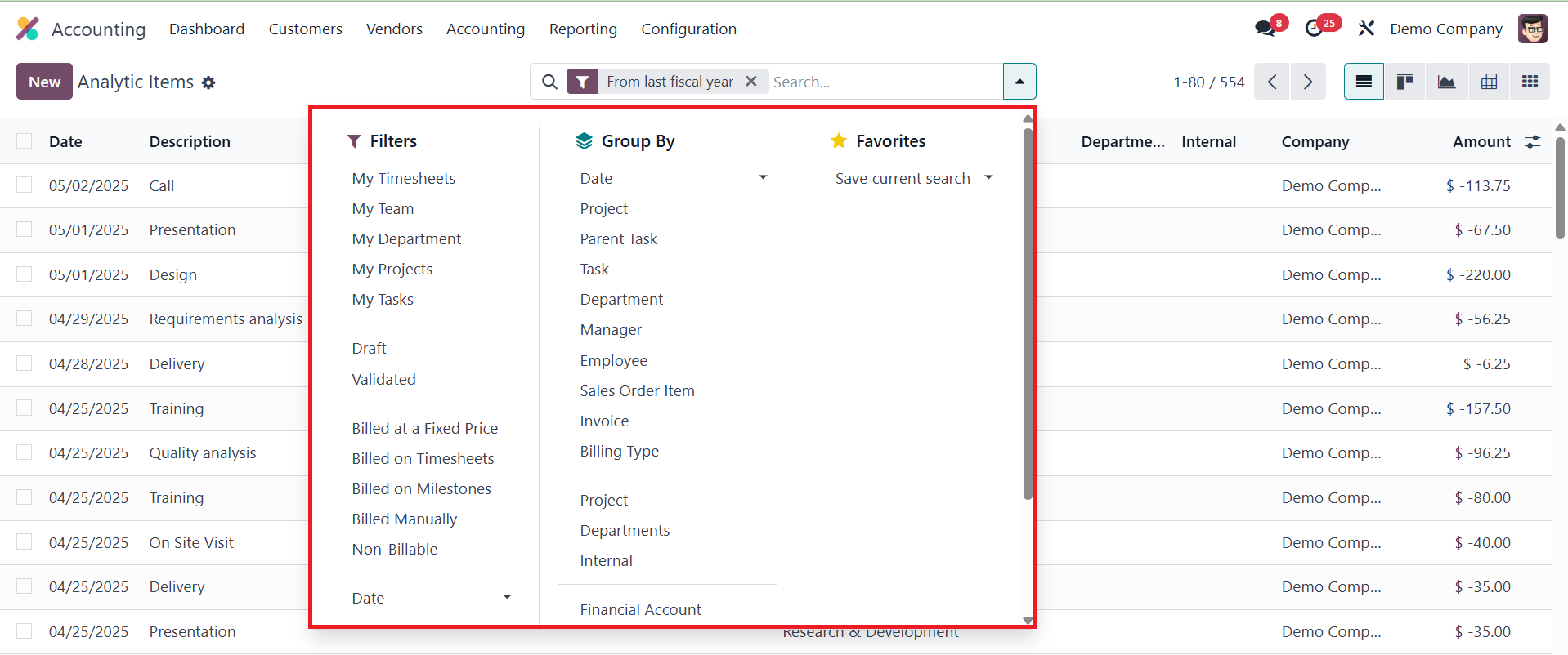 The platform also supports grouping and filtering options, allowing users to group items based on analytic accounts or other relevant criteria for better clarity.