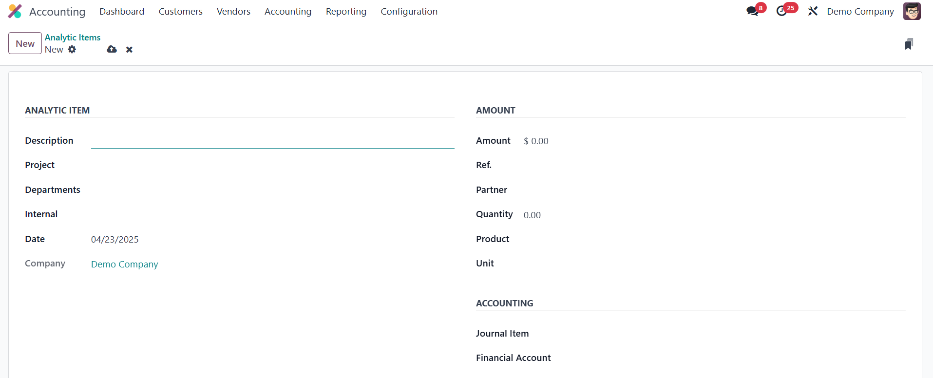 To manually add a new analytic item in Odoo 18, you can click the New button and fill in various fields for a detailed record. The Description field allows you to provide a brief note explaining the purpose of the analytic item, such as "Marketing Campaign Expenses." The Date specifies when the analytic entry is recorded, helping align it with relevant accounting and reporting periods. The Company field is important for multi-company environments, ensuring the item is associated with the correct company. The Analytic Account links the item to a specific account, such as a project or department, used for categorizing and tracking related costs or revenues. Respective Project and Department can be seen here. The Amount field records the financial value of the transaction, whether it's income or an expense.