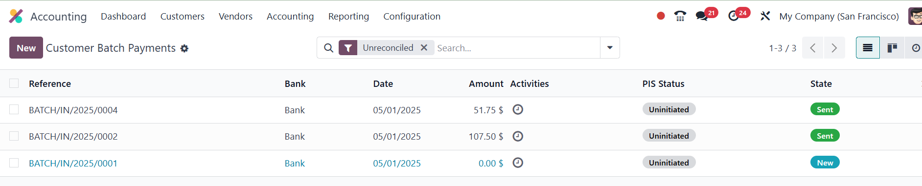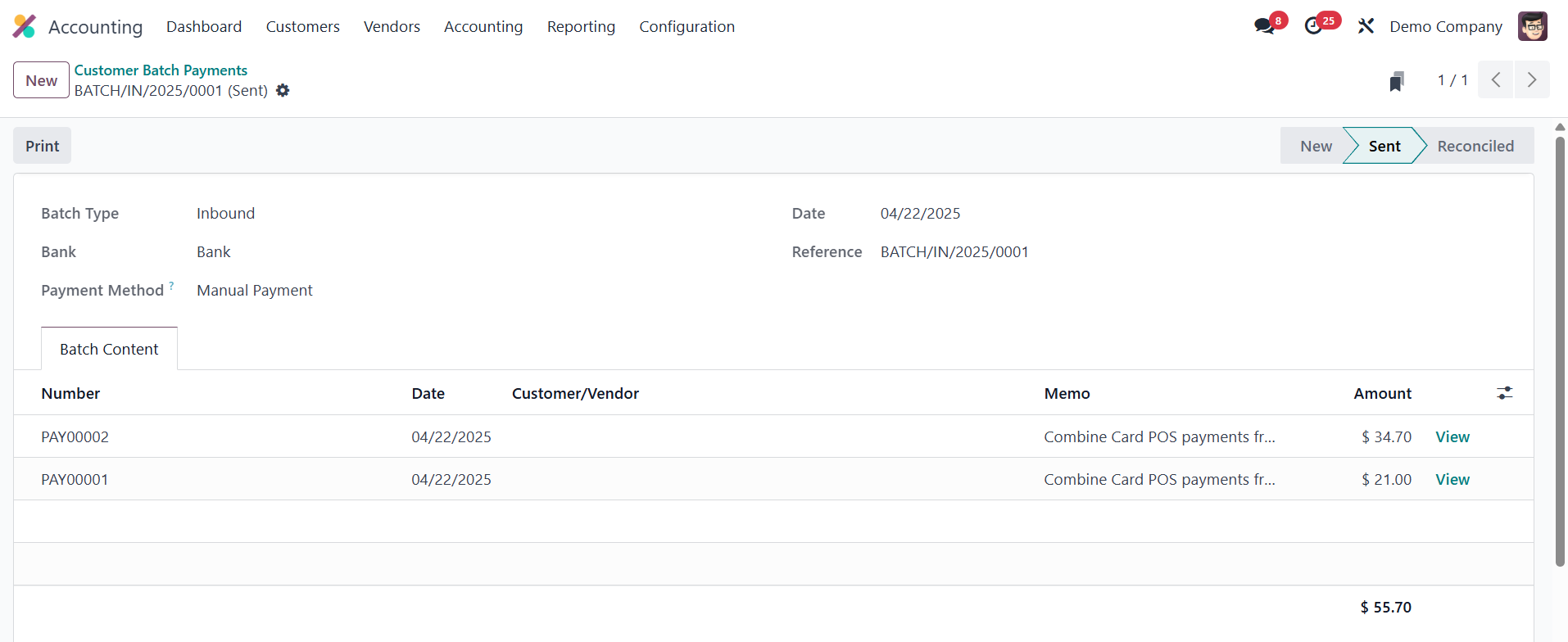 Once validated, the batch moves into the Sent state, indicating that