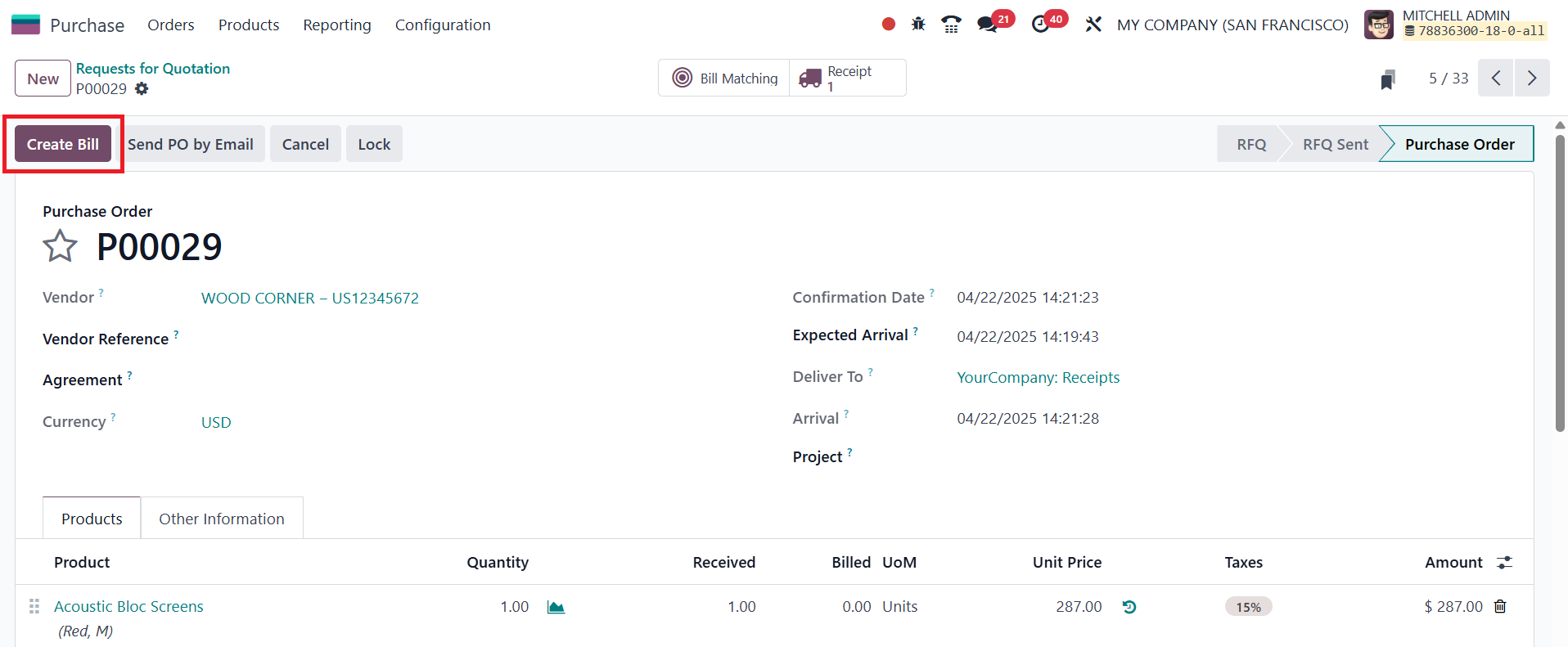 vendor bill by selecting the Create Bill option.