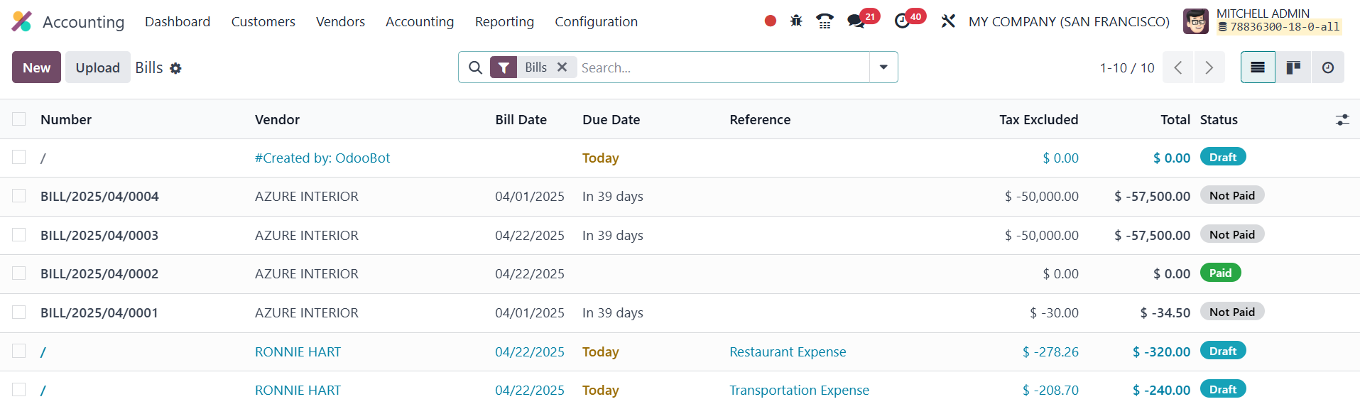 filters include categories like Draft, Posted, Cancelled, Bills,