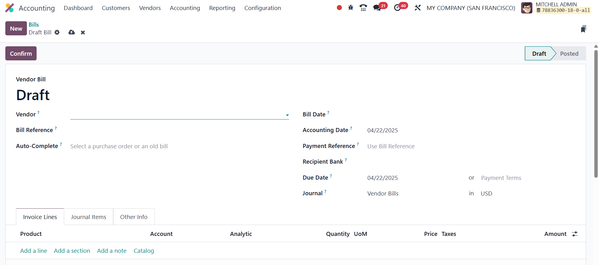 In Odoo 18 Accounting, vendor bills are essential records that