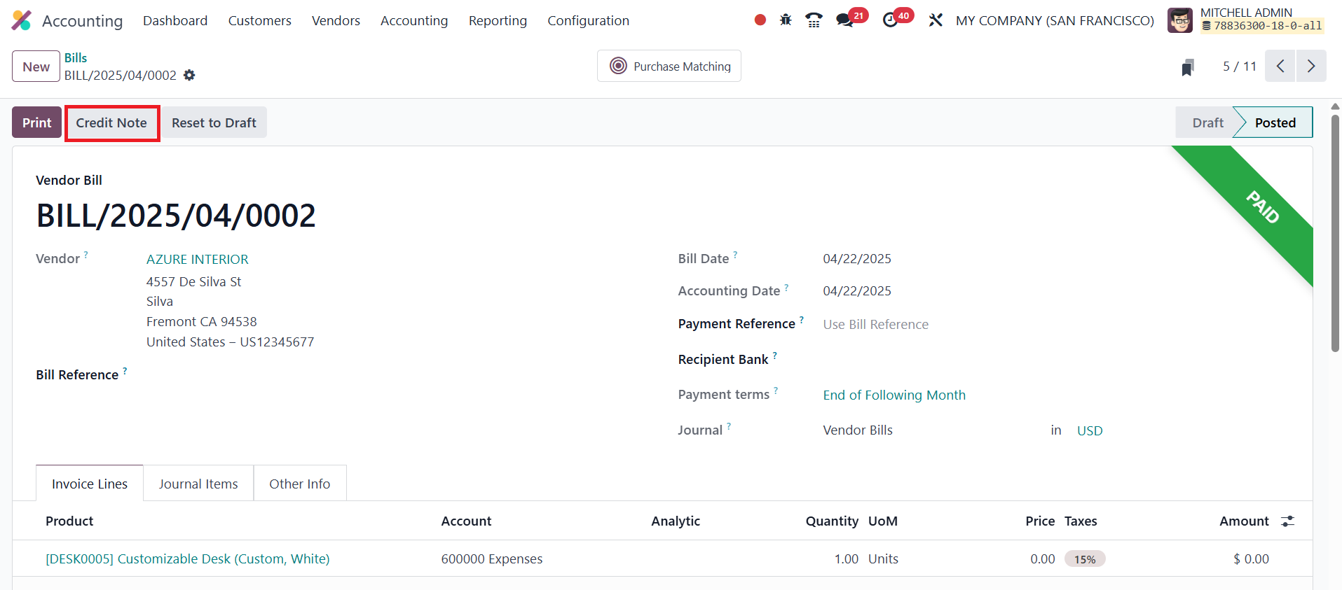 When viewing a vendor bill, the Add Credit Note button lets users