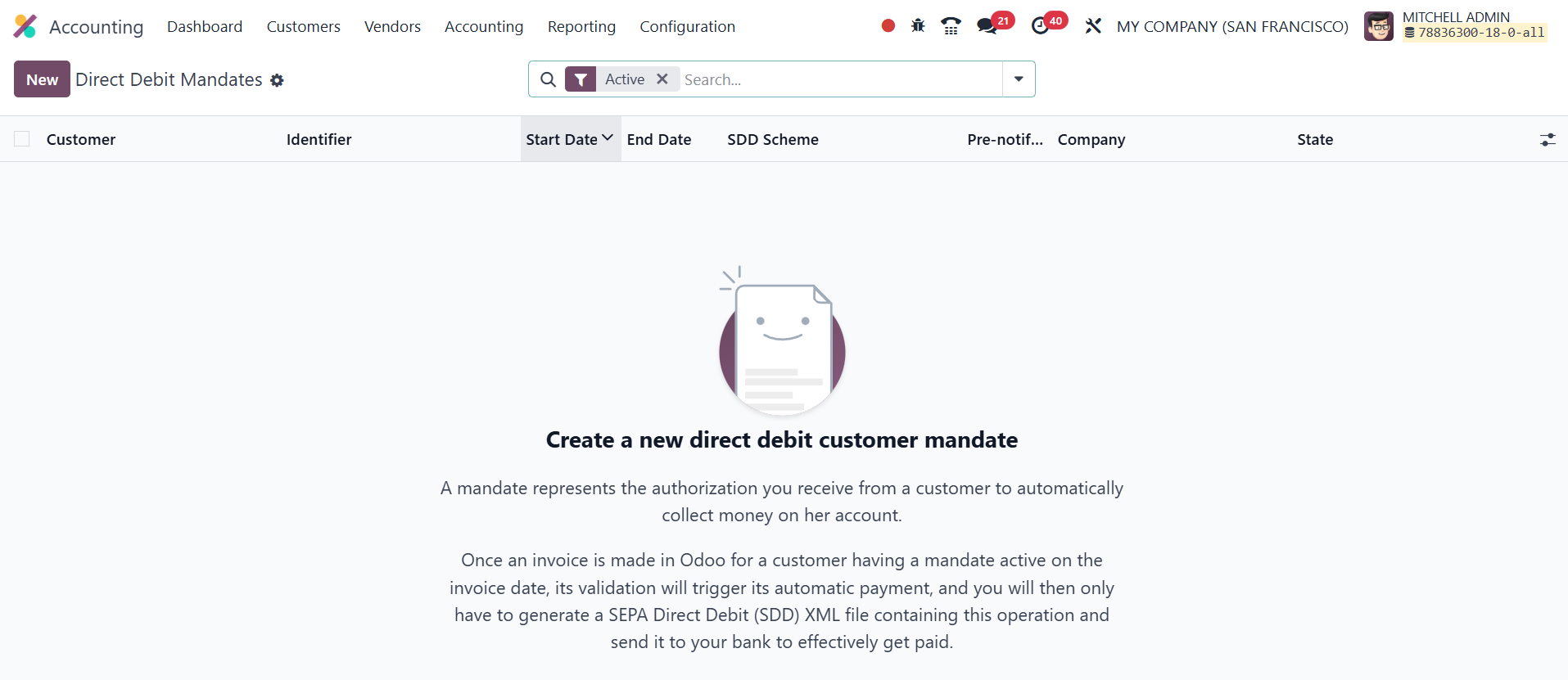 valid mandate is invoiced, Odoo will automatically generate a SEPA