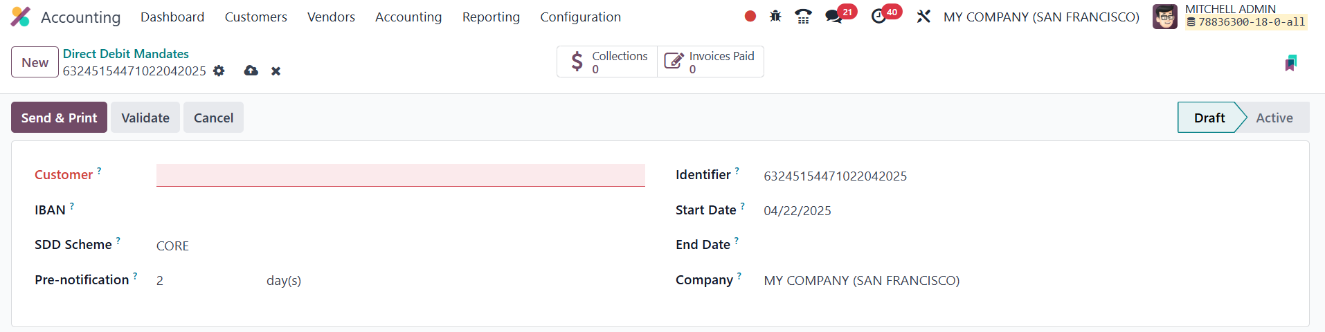Validate button to activate the mandate. When a customer with a