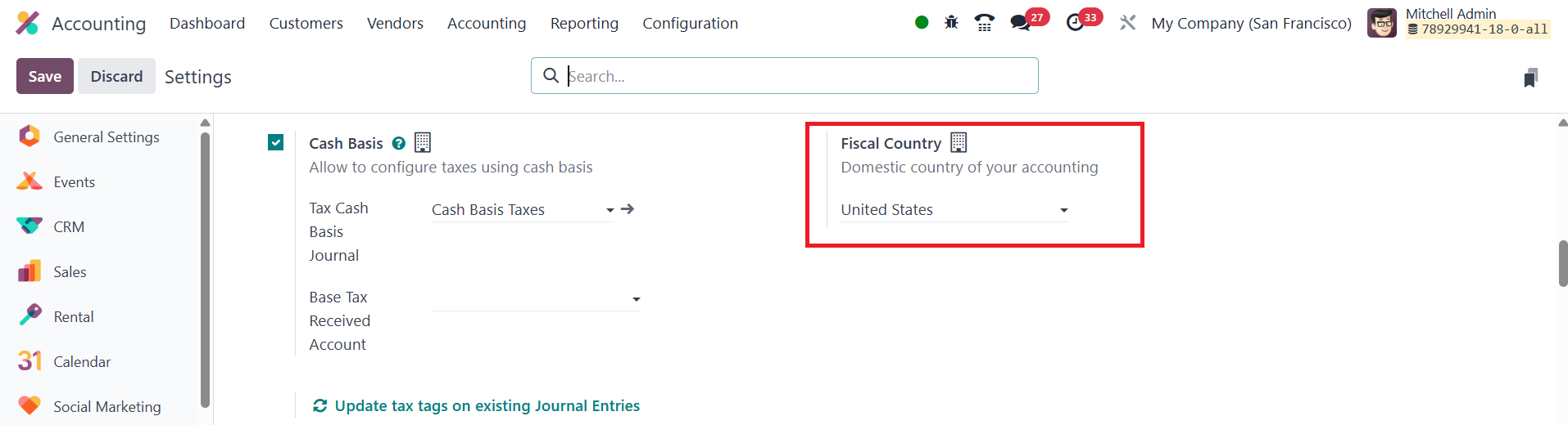 Accounting ▸ Settings. In the Taxes section, set your home Fiscal
