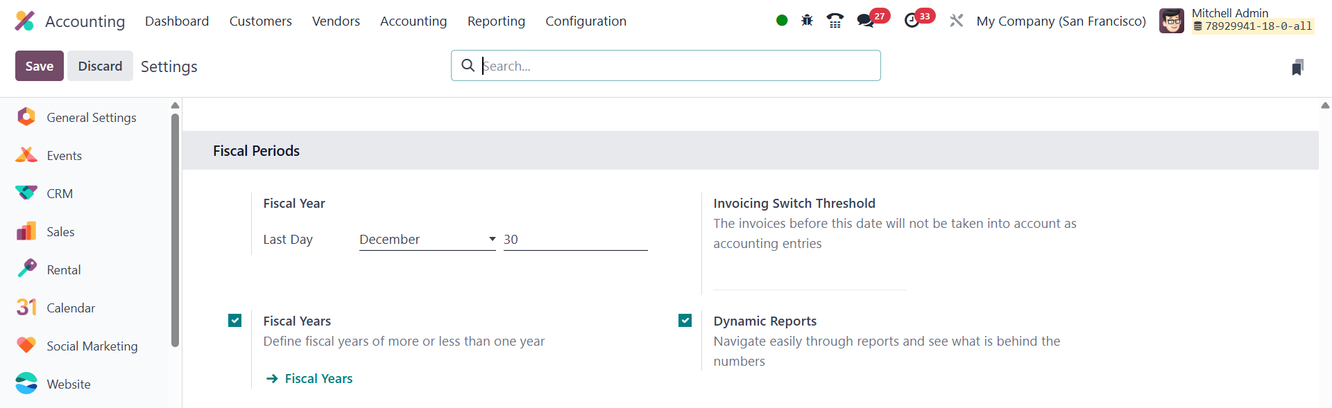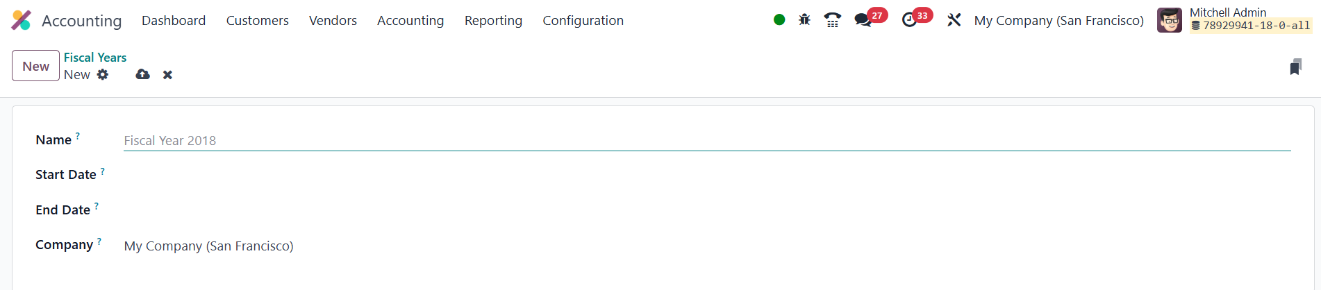 year so Odoo can automatically open new periods; enable Fiscal Years