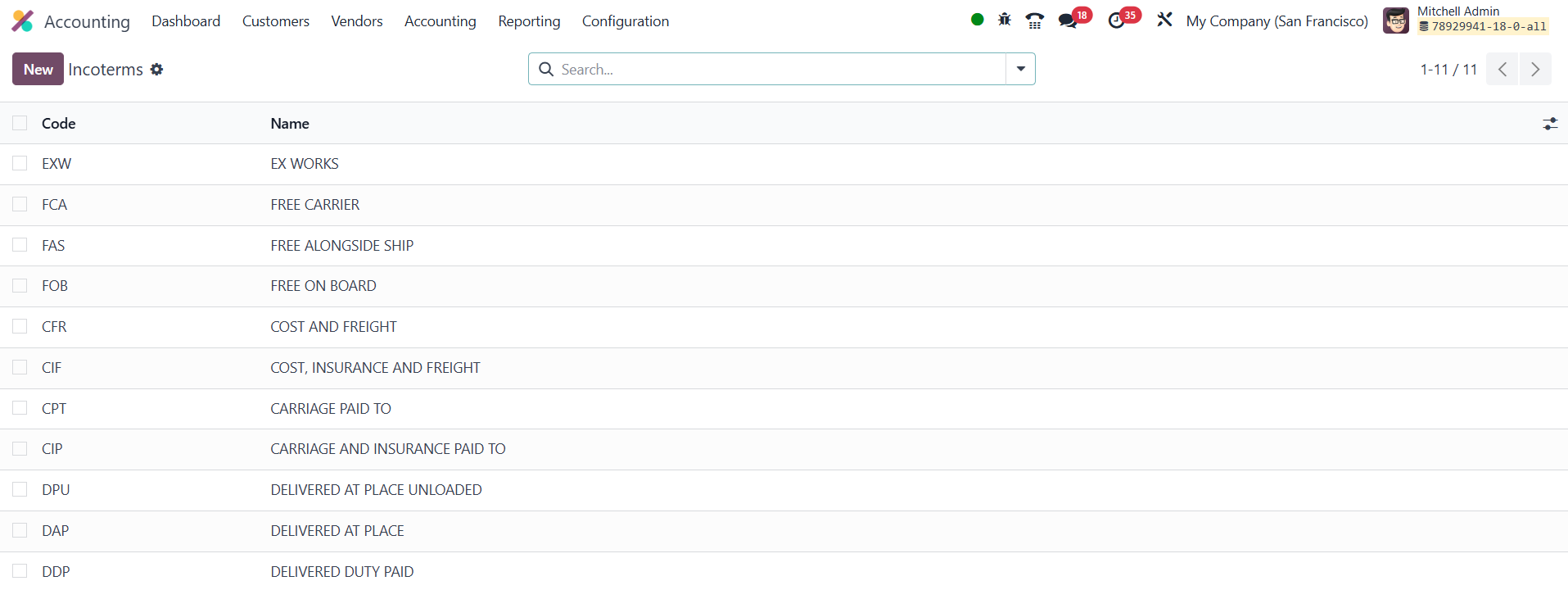 Accounting → Configuration → Incoterms and Odoo opens a grid that