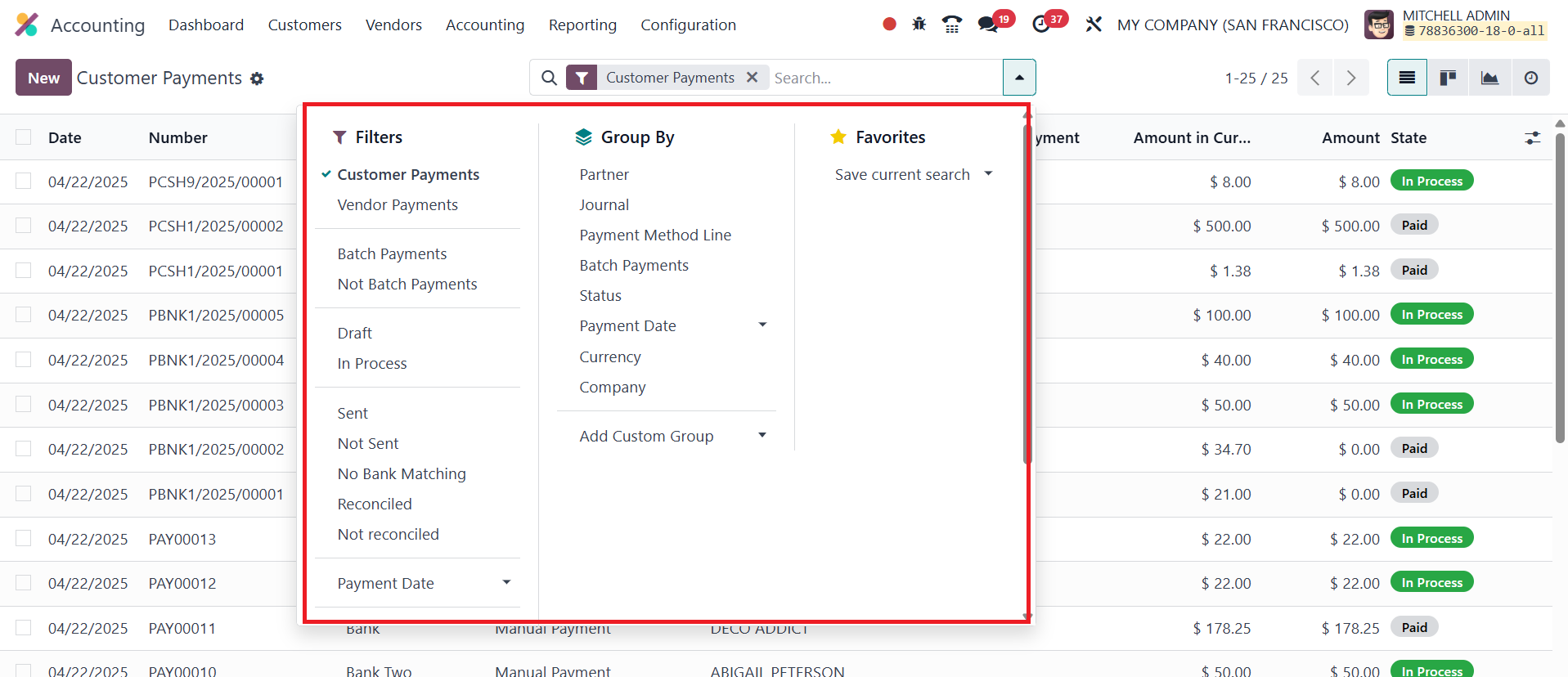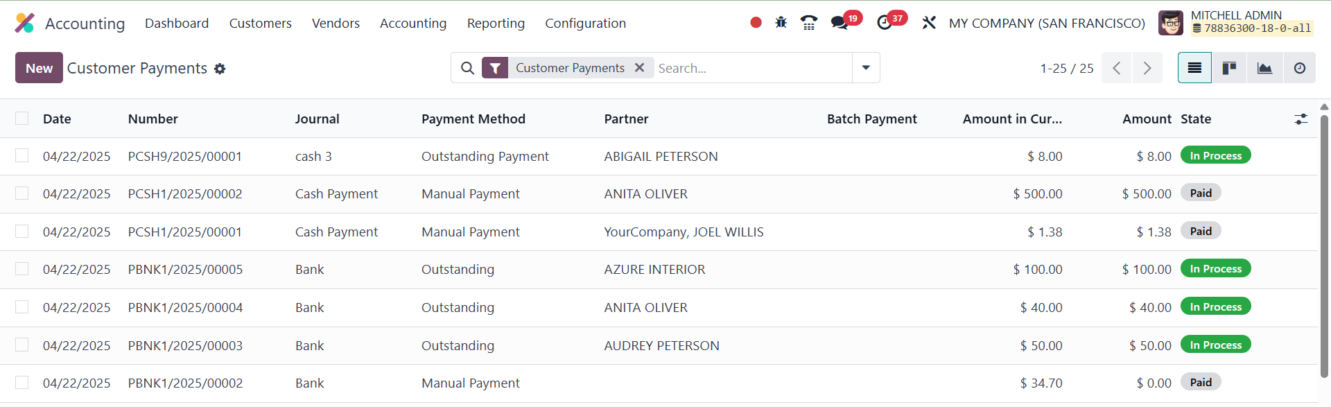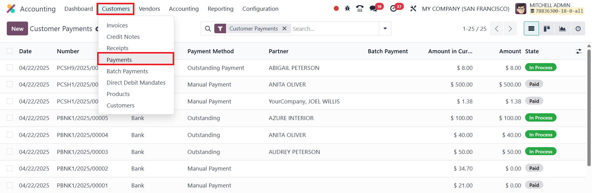 The Payments feature in Odoo 18 Accounting offers a comprehensive