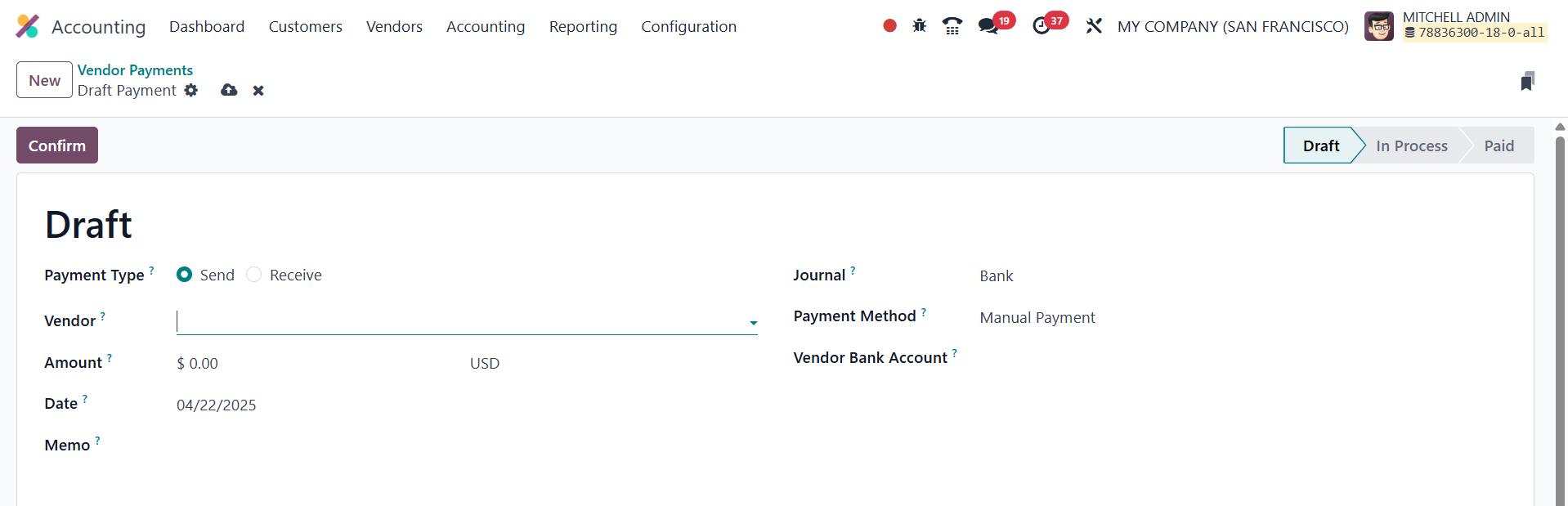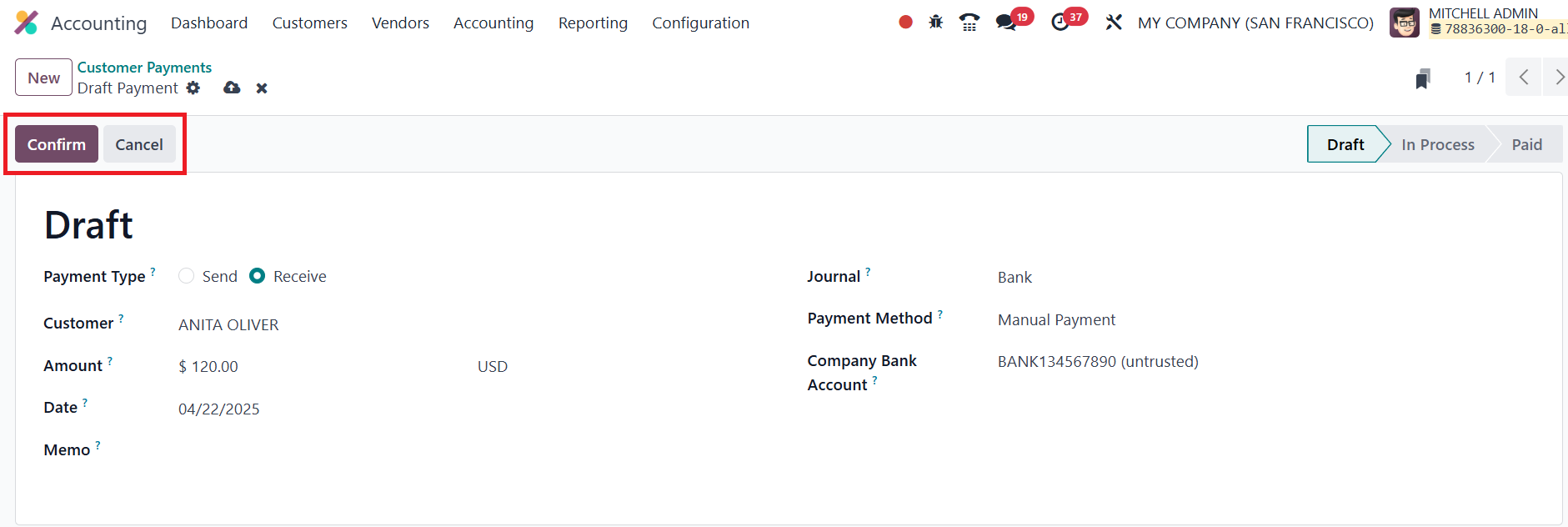 Payment Method, and the Company Bank Account. Odoo 18 supports a