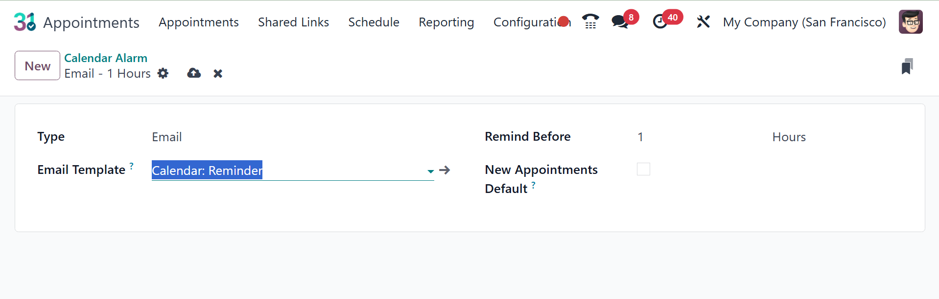 alarms to new appointments. Click the Save icon now to add this