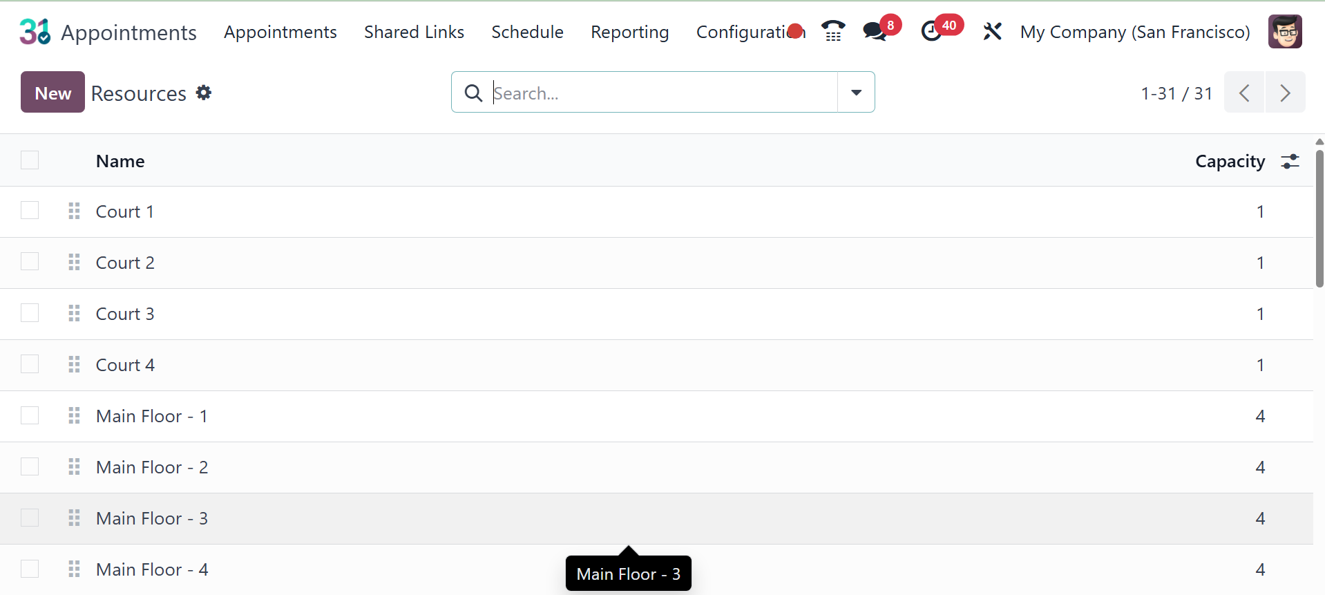 a resources option. The page lists capacity and appointment
