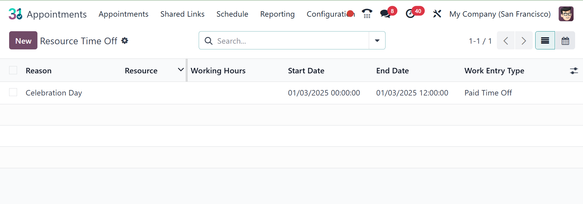 working hours, resource, work entry type, start date, and end date,