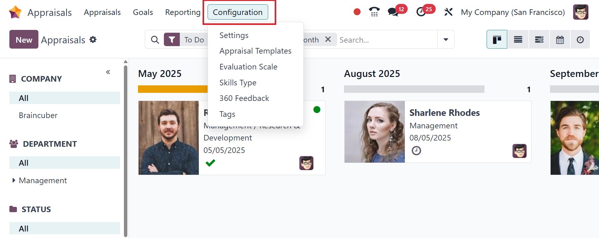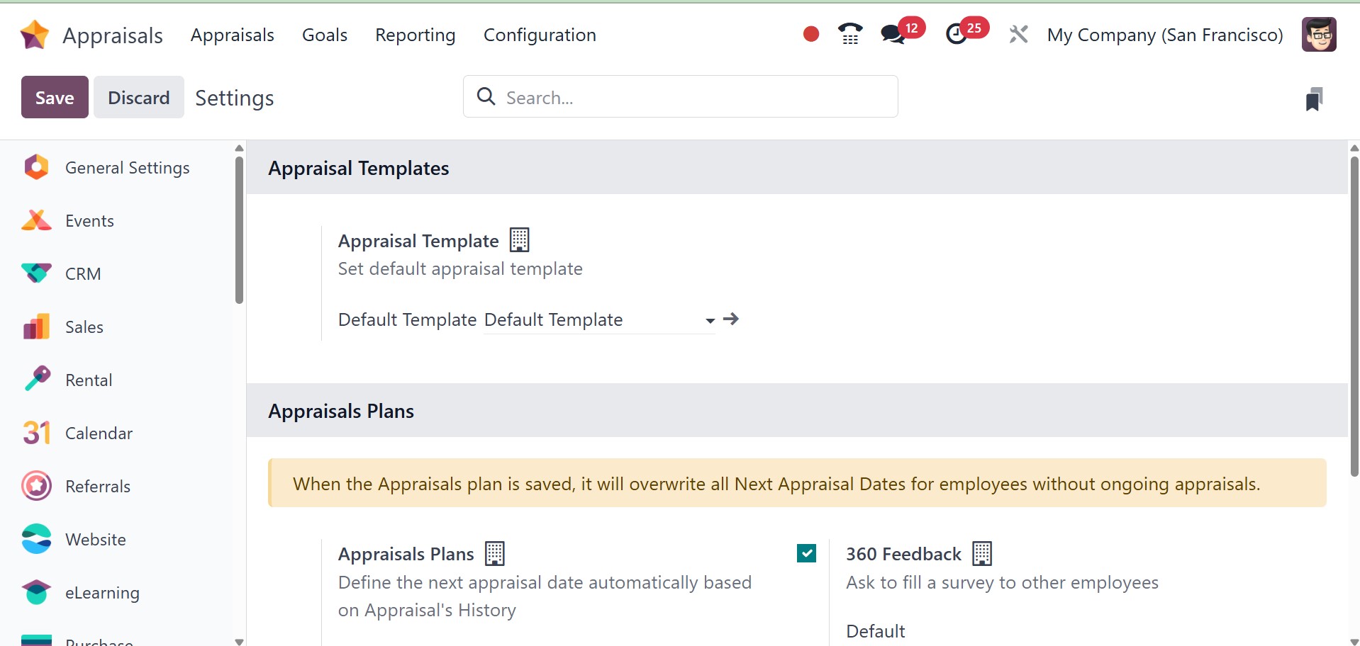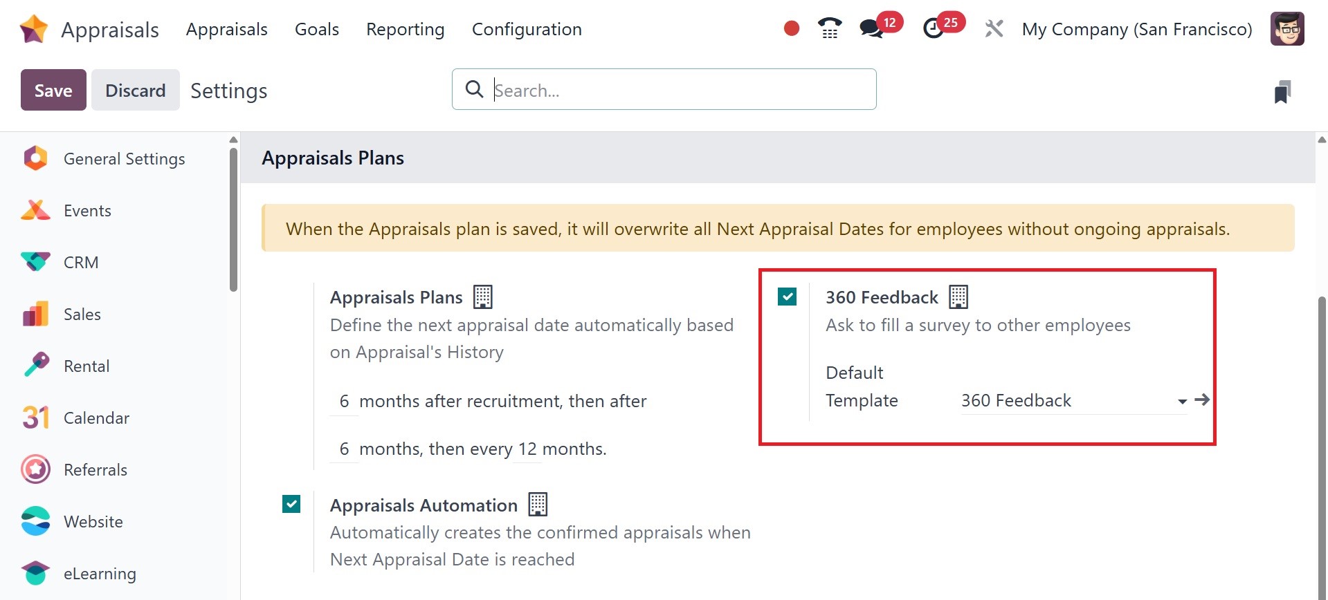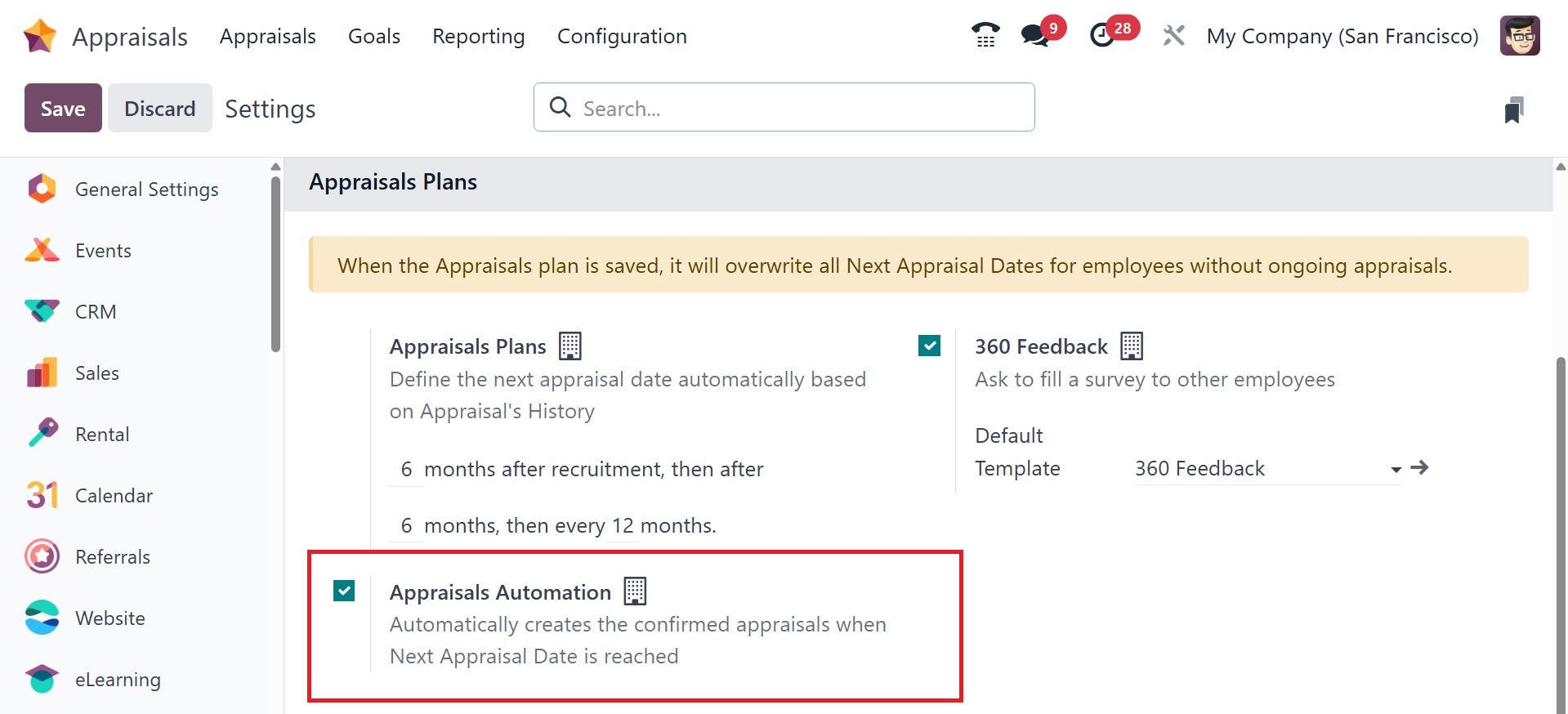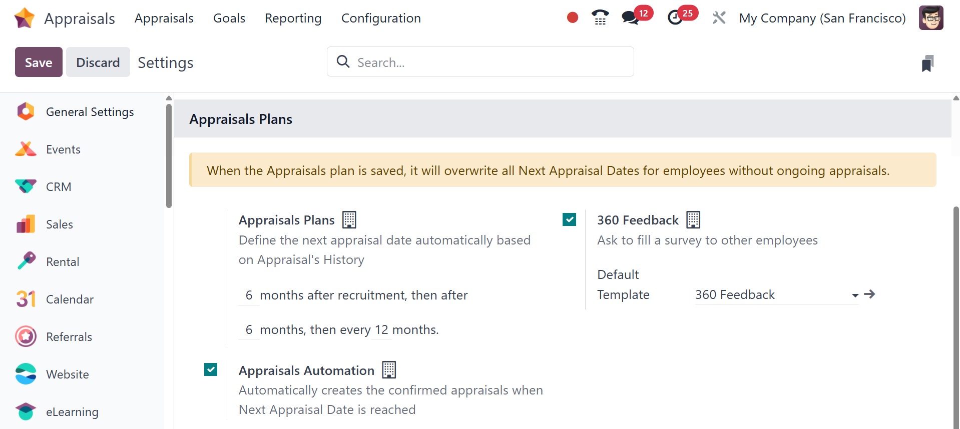 In the Settings panel, we can then manage employee evaluations. Making appraisals automatically is easy if the Appraisals Plans option in the Appraisals section is enabled. Under the appraisal area, you can specifically specify the months after hiring.