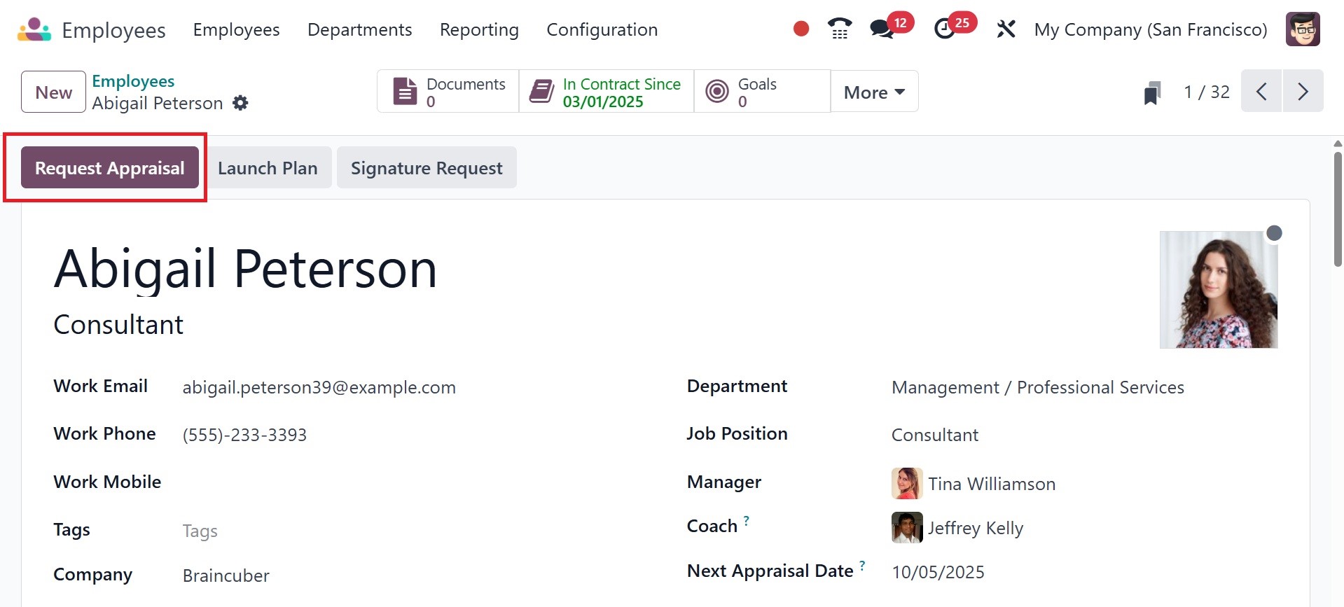 This will instantly update the employee's next appraisal date in the Employees module's employee form. By clicking the "Request Appraisal" button, employees can easily request the next appraisal.