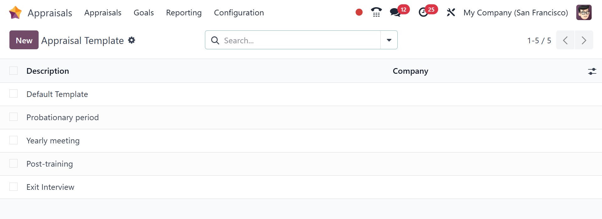 Under the appraisal template option in the configuration, you can have the pre-configured appraisal templates, as in the image below.