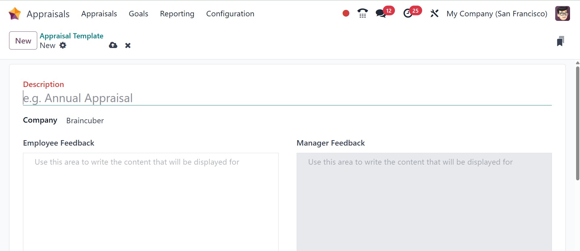 Using the NEW option, you can add the description, company, employee feedback, and manager feedback, as in the image below.