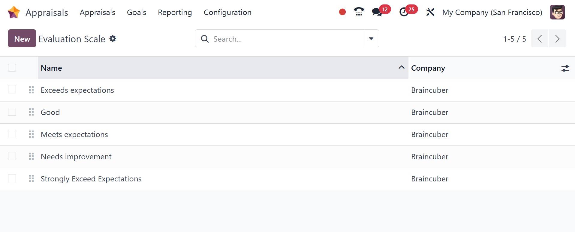 To assist with that, you may set a few evaluation scales under the Configuration tab. By choosing the Evaluation scale menu in Configuration, a user can get a list of all current rates. The Evaluation Scale pane displays the Company and Name data. In the Evaluation Scale window, choose the New icon to create a new one.